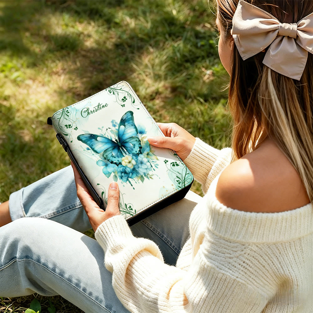 This Bible cover merges a delicate blue butterfly (a symbol of spiritual renewal) with personalized detailing — pairing soft, artistic design with the quiet promise of His work in your life to craft a devoted companion for your sacred text. -