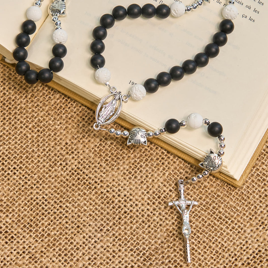 This Matte Black and White Lava Stone Rosary & Bracelet, with Cat Charms, blends spiritual devotion and love for creation. The crucifix anchors faith, while cat motifs honor God’s gentle care for all creatures—turning prayer into a celebration of divine love for pets.