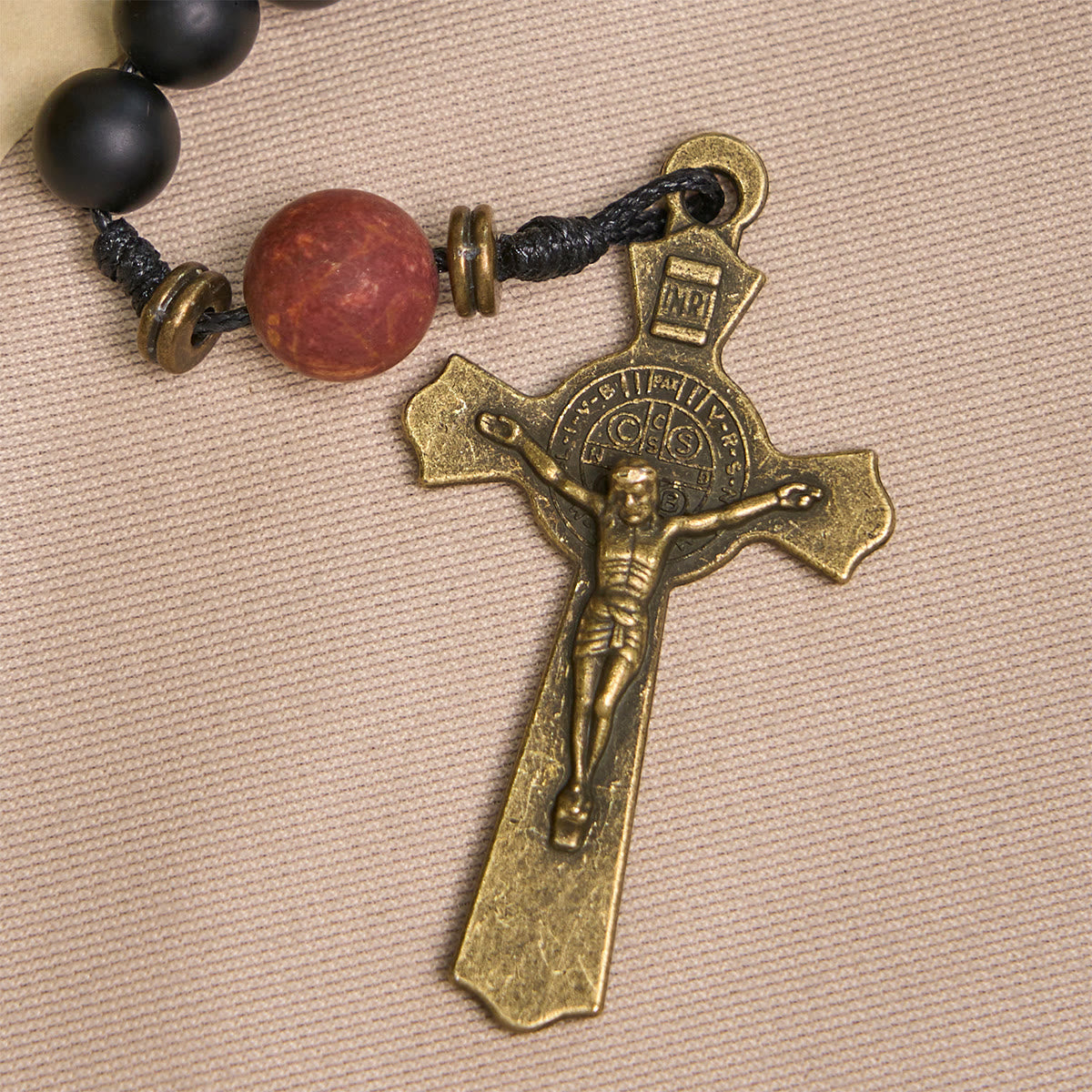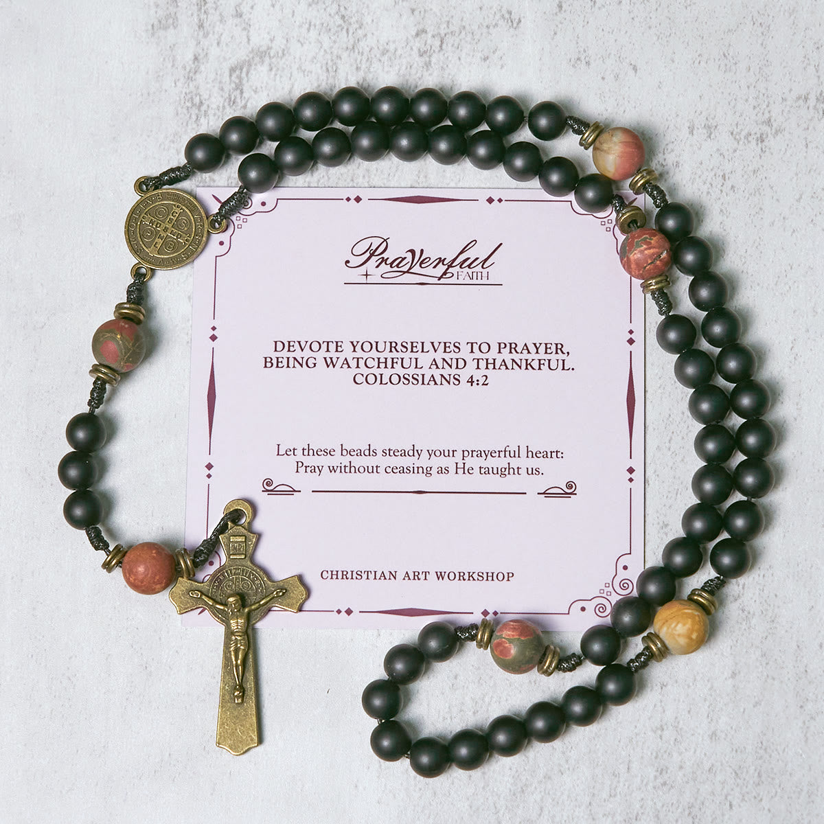 Matte black beads with earthy accents frame the St. Benedict medal—honoring the saint known for shielding against evil and negative forces. -