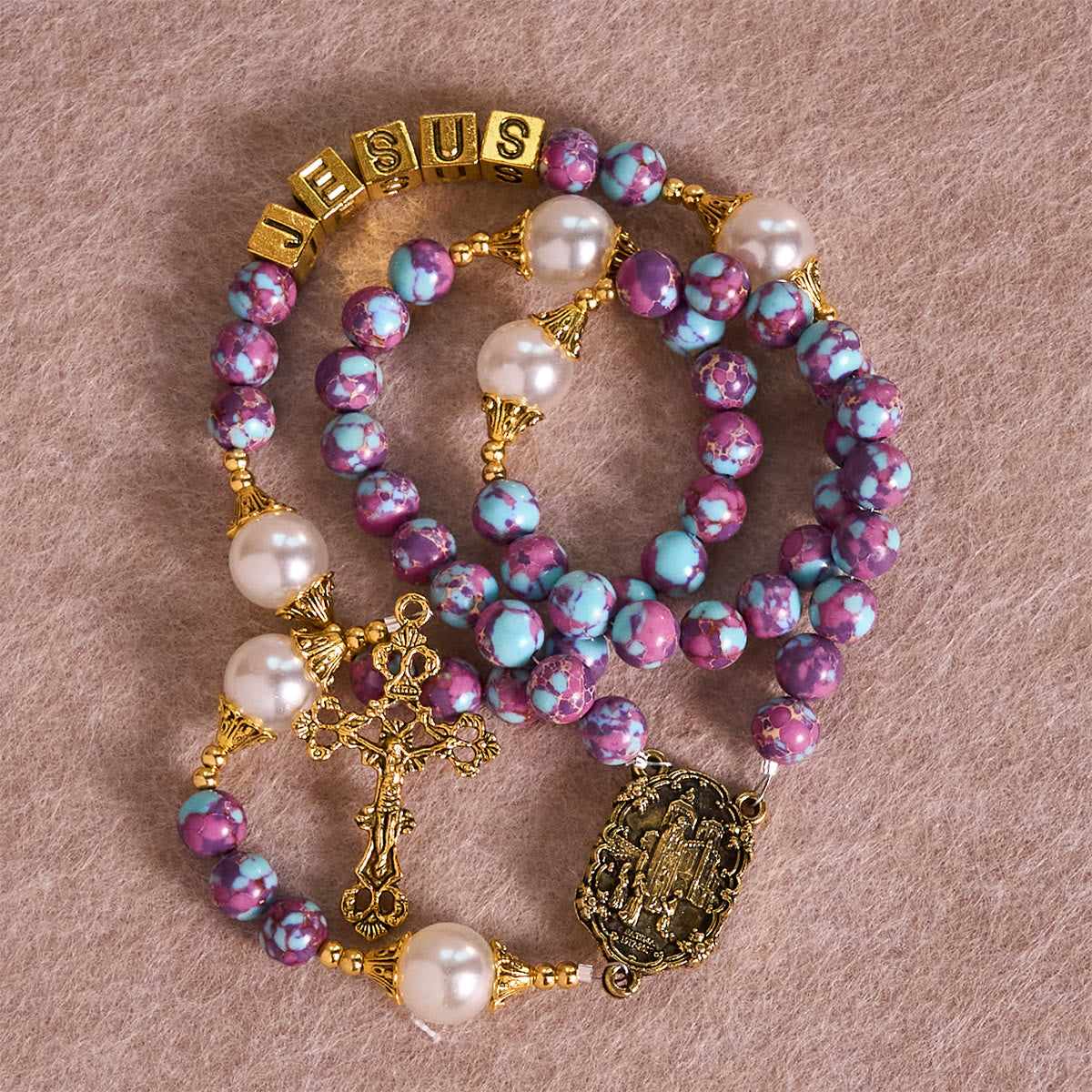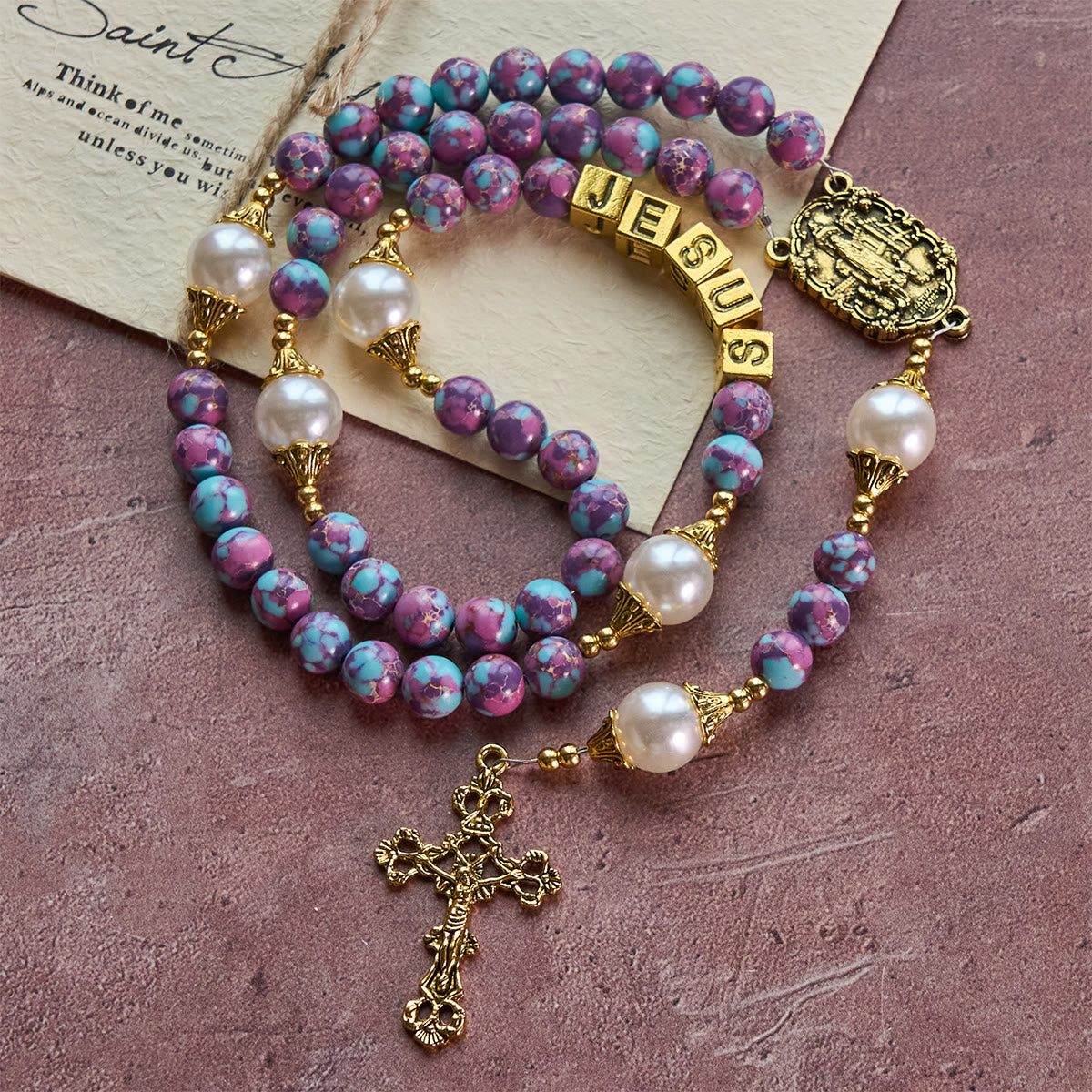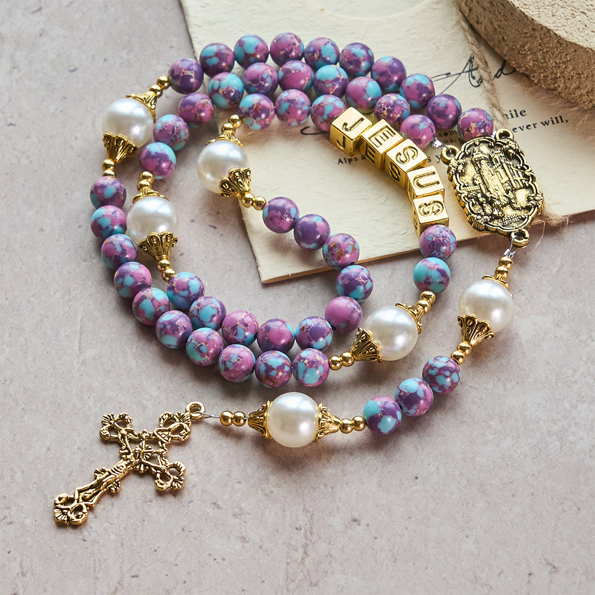 This exquisite custom rosary unites faith, beauty, and devotion in a royal palette of purple and gold. Handcrafted from Emperor Stone beads and adorned with a golden crucifix, Our Lady centerpiece, and personalized “JESUS” letter blocks, it reflects the majesty of divine love — prayer given the form of art.