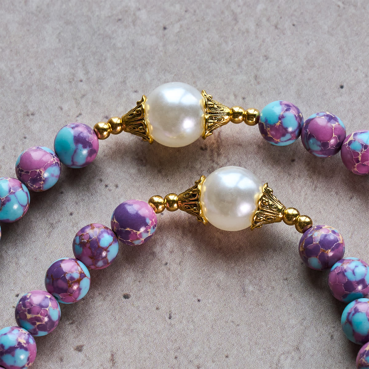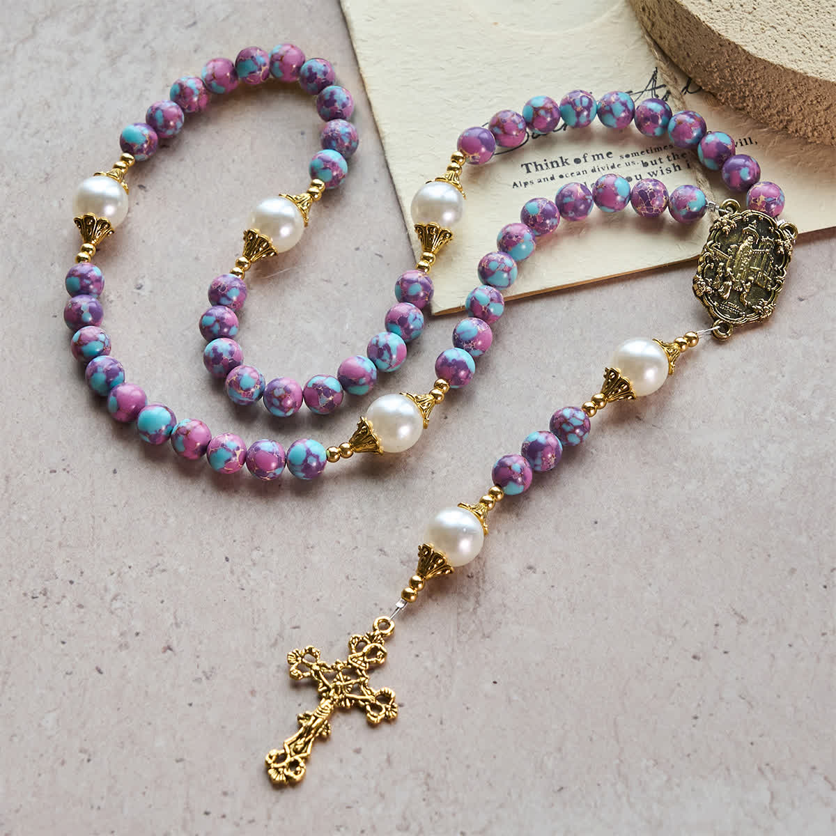 Each bead glows with a sacred depth: the purple Emperor Stones represent repentance, holiness, and royal dignity — the color of Christ’s kingship and His Passion. Their marbled tones mirror the mysteries of faith itself — a quiet journey from sorrow to redemption, from prayer to peace.