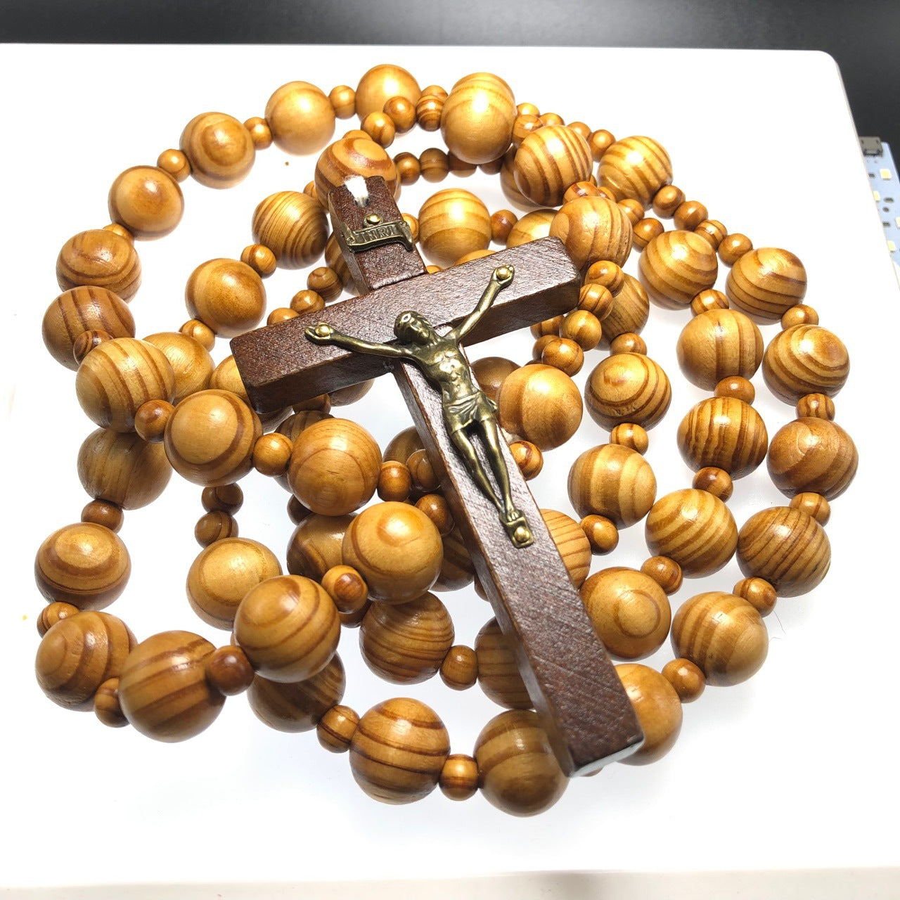 This wooden rosary merges smooth, natural beads with a detailed crucifix (a symbol of sacrifice and grace) — pairing spiritual purpose with earthy warmth to create a soothing companion for quiet prayer. -