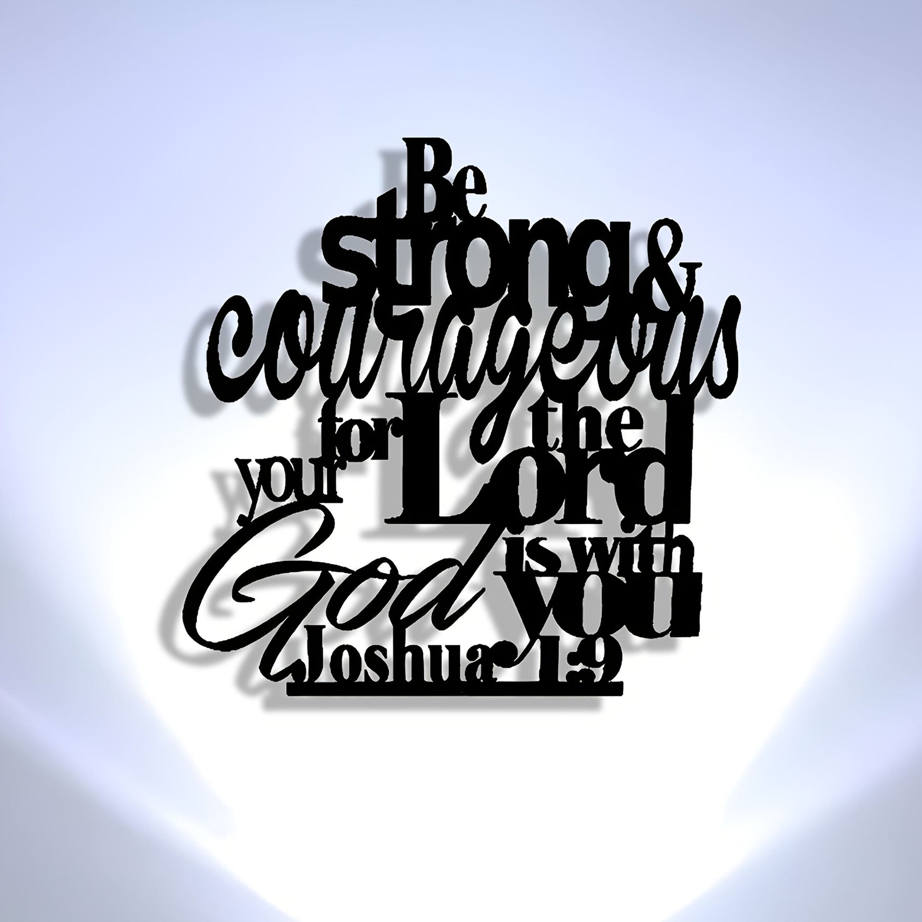 Layered lettering declares Joshua 1:9—“Be strong and courageous… for the Lord your God is with you.” The bold “Lord” at the center anchors the eye and the heart, proclaiming courage that flows from God’s nearness, not from self-confidence. -