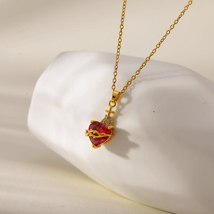The pendant is the core highlight of the necklace. The heart-shaped red gem is bright and eye-catching, symbolizing fervent love. The stainless steel vine shape surrounding the gem is carefully crafted with delicate craftsmanship, and the lines are smooth and natural. The cross shape at the top of the vine gives the necklace a sacred meaning, making this love more solemn and eternal. -