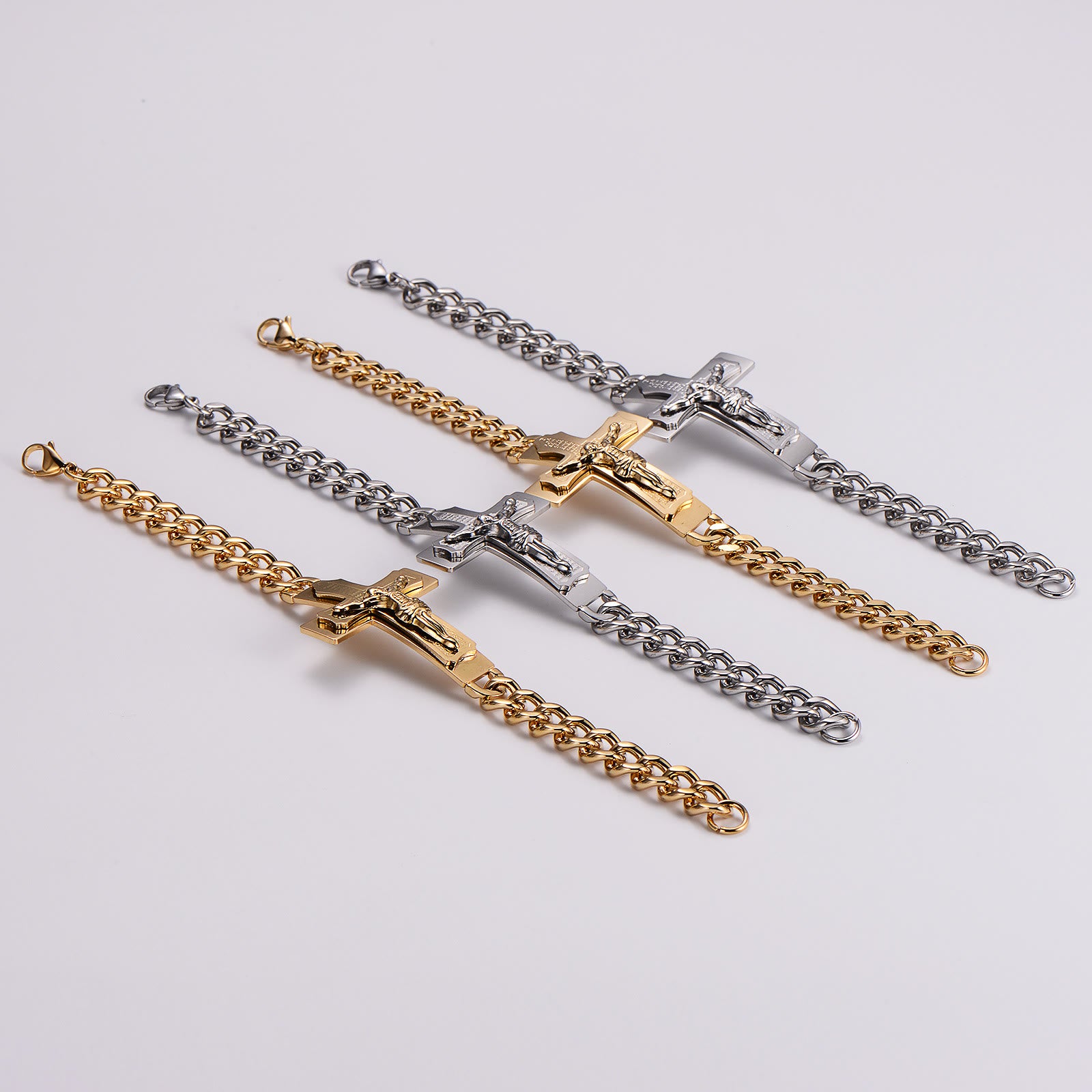 A chunky metal chain bracelet (in golden and silver tones), featuring a stainless steel cross with a detailed Jesus crucifixion figure and scripture engravings, stands as a bold testament to faith and style.