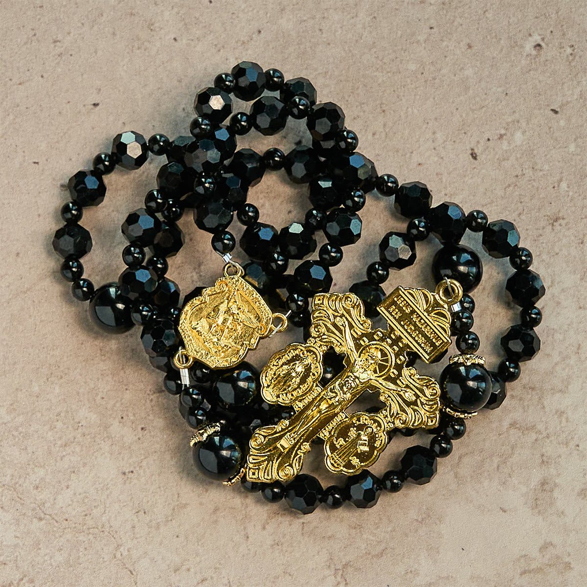Handmade with faceted black beads, this rosary unites a St. Michael devotion and a Pardon Crucifix—bringing protection and mercy to every decade. -