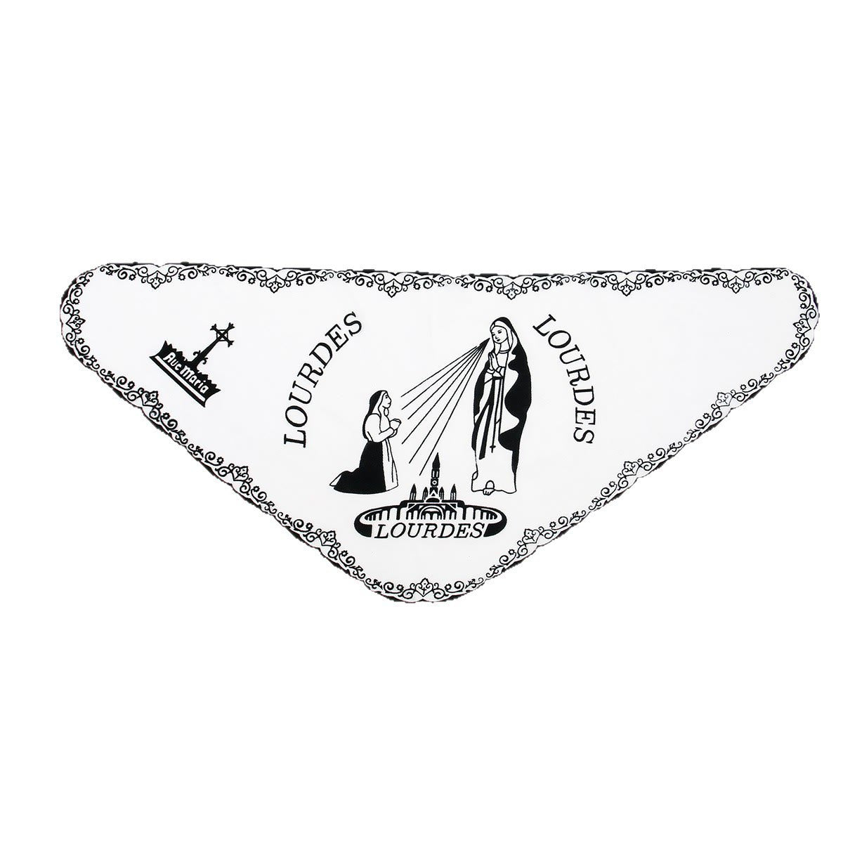 This Lourdes veil scarf (featuring the iconic apparition of Our Lady to St. Bernadette, the Lourdes skyline, and delicate scrollwork) merges sacred pilgrimage symbolism with soft, sheer design — turning daily wear into a gentle, meaningful reminder of Her intercession. - Soft, Lightweight Companion for Spiritual Moments