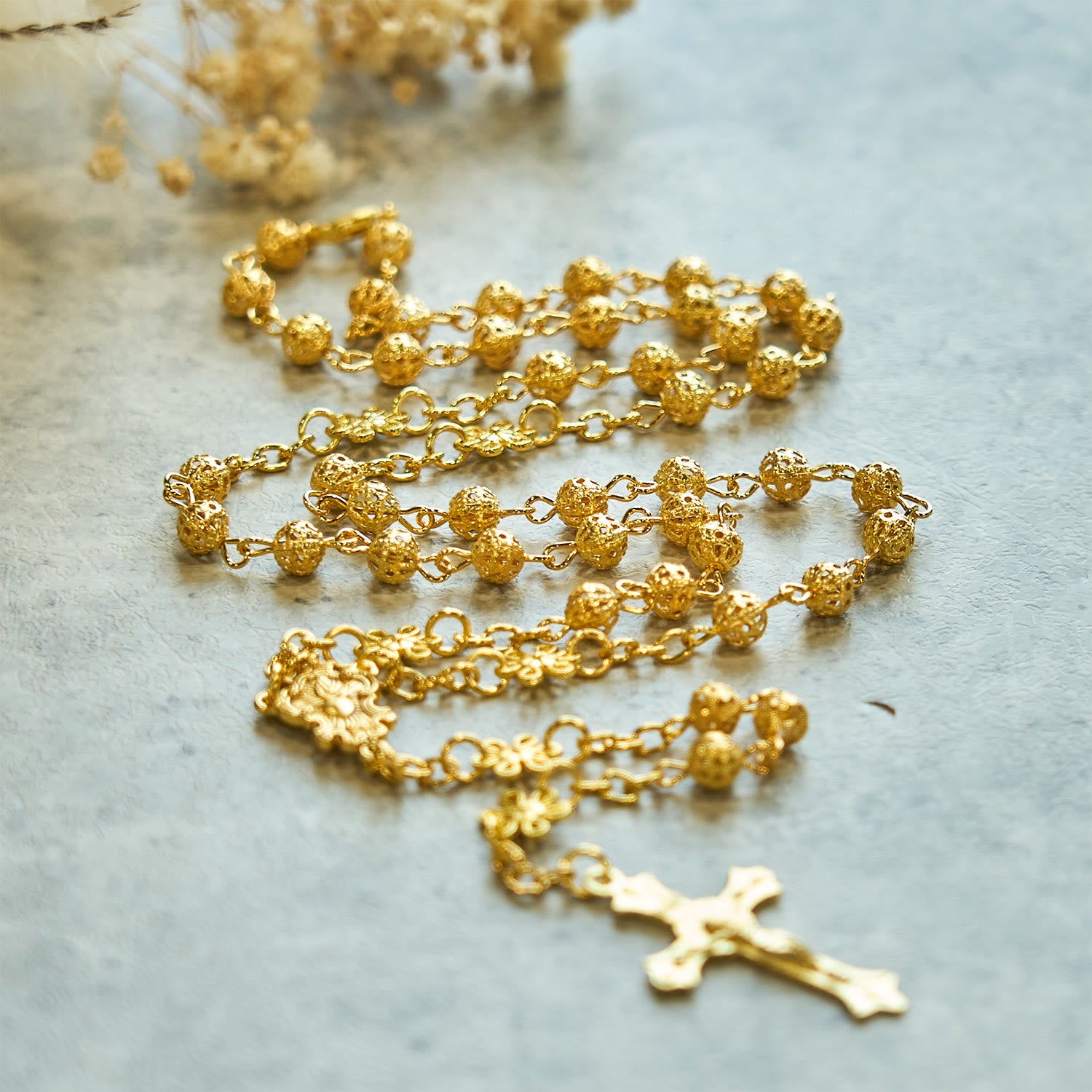 The golden metal beads symbolize God's glory. The crucifix represents Jesus' sacrifice, central to our faith. The detailed centerpiece invokes saints' intercession and divine blessings. -