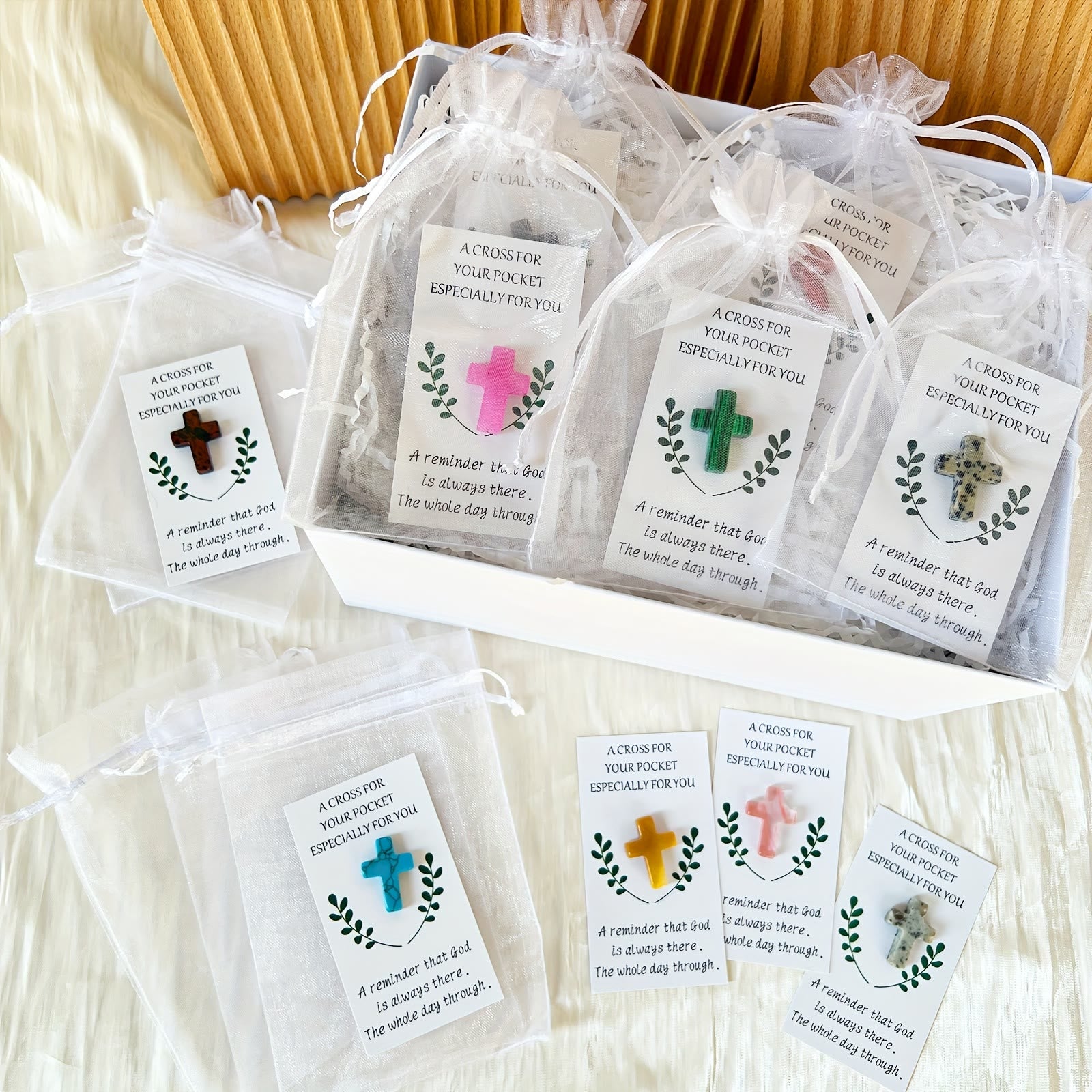 Meticulously made with random, gentle materials, each compact cross fits easily in pockets. The organza bag packaging and delicate card add tender appeal, turning the set into a versatile faith companion. -