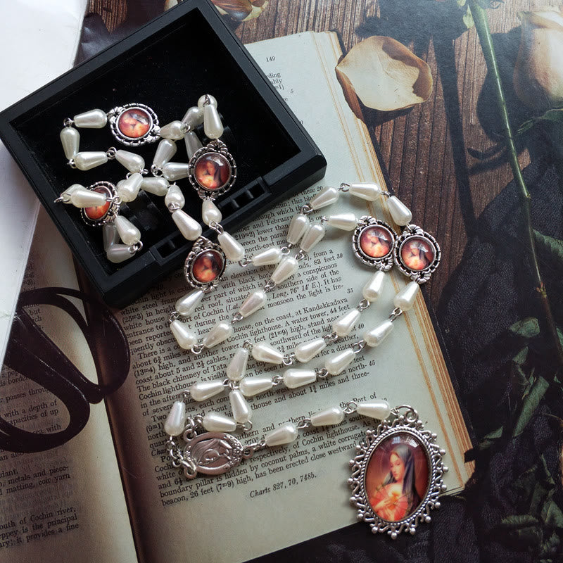Christianartworkshop Immaculate Heart of Mary of 5*10 mm Drop-shaped White Pearl Alloy Chain Rosary