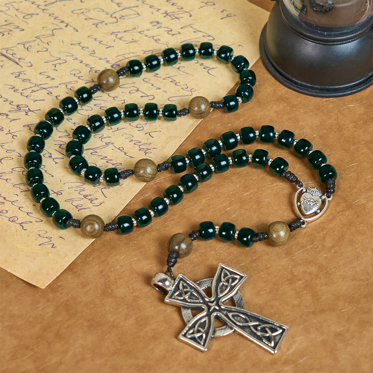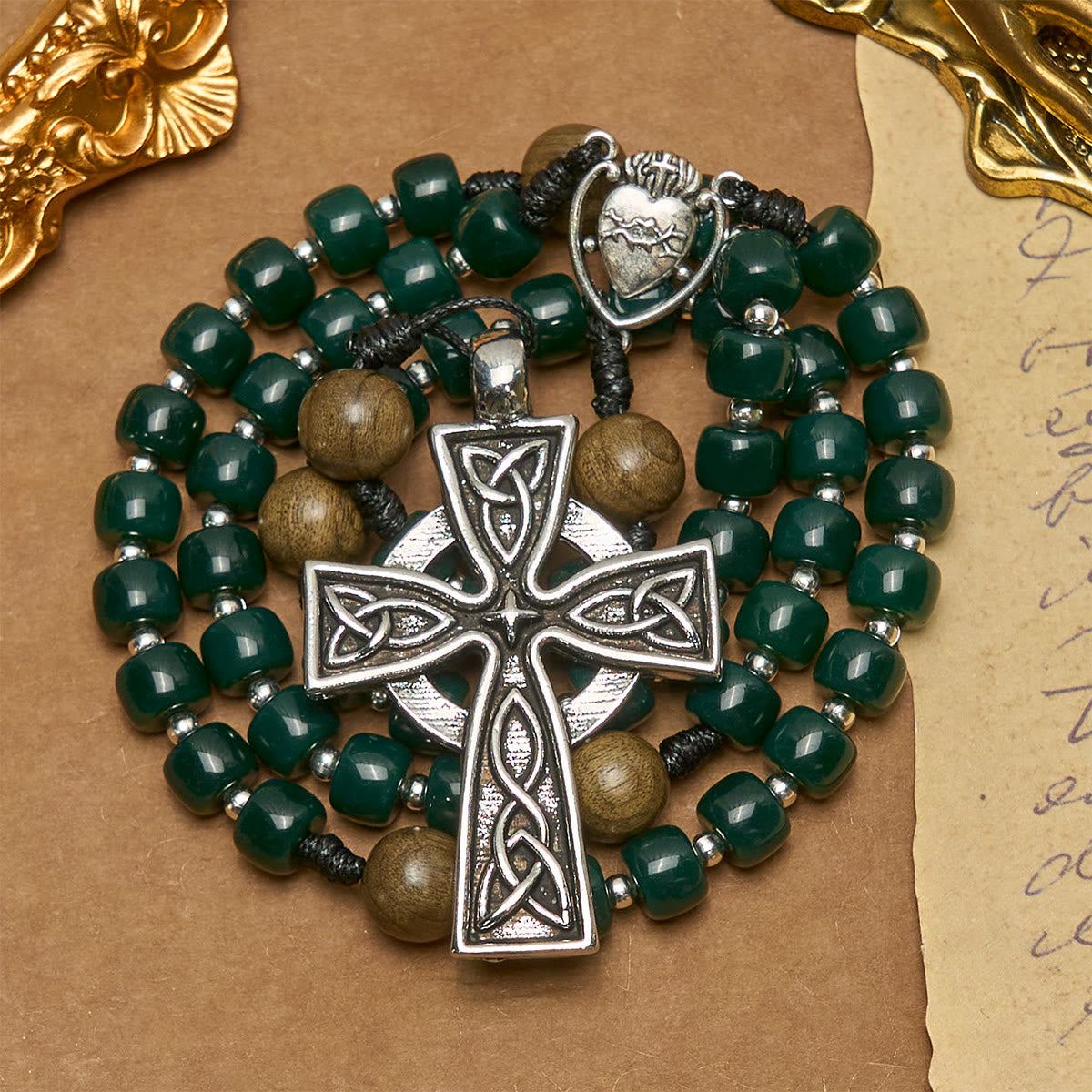 Earthy matte green cube beads offer clean lines, flowing to the Sacred Heart of Jesus medal and intricate Celtic cross—a timeless fusion of divine protection and ancient spirit. -