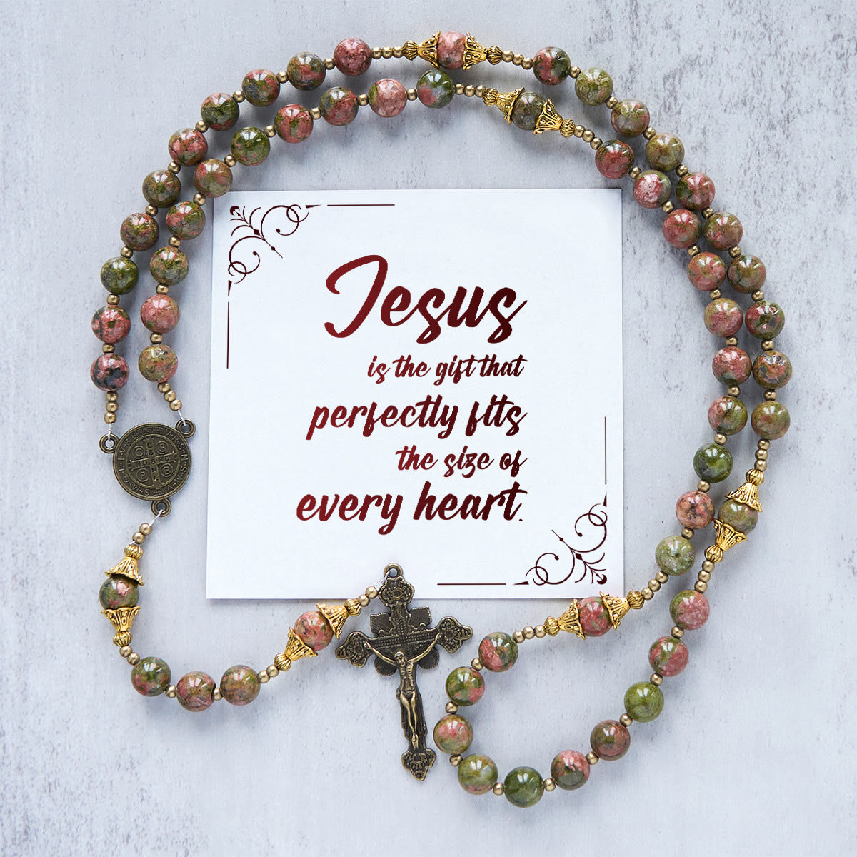 • Delight in the elegance and spiritual grace of our handcrafted rosary. Each bead is meticulously polished, blending soft shades of earthy greens and warm rose tones to enhance your prayerful experience. The rosary features intricate golden accents and a beautifully detailed crucifix, symbolizing unwavering faith and eternal hope.