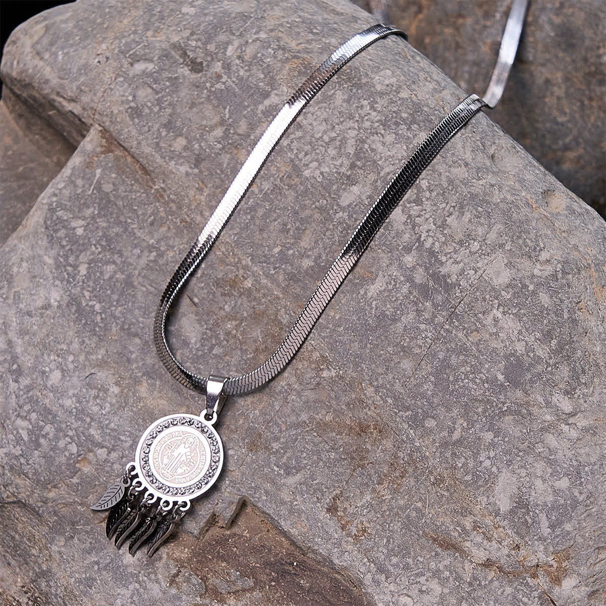 A pendant featuring a saint icon — circled by zircons and paired with feather charms — serves as a glowing testament to faith. Its polished luster and intricate design blend spiritual meaning with modern elegance.