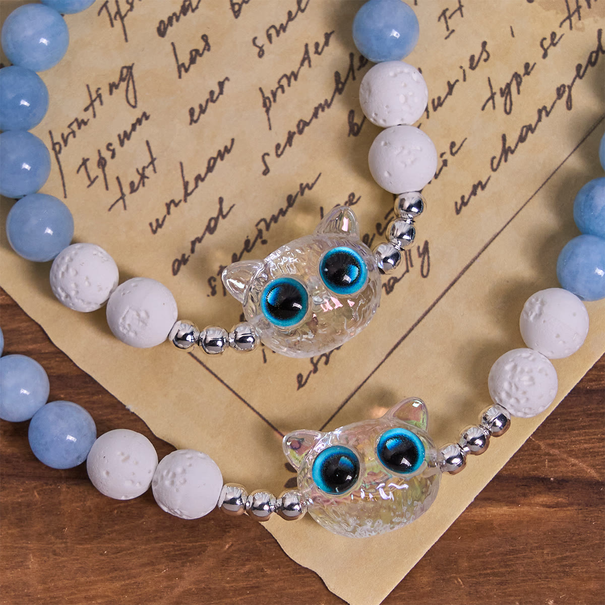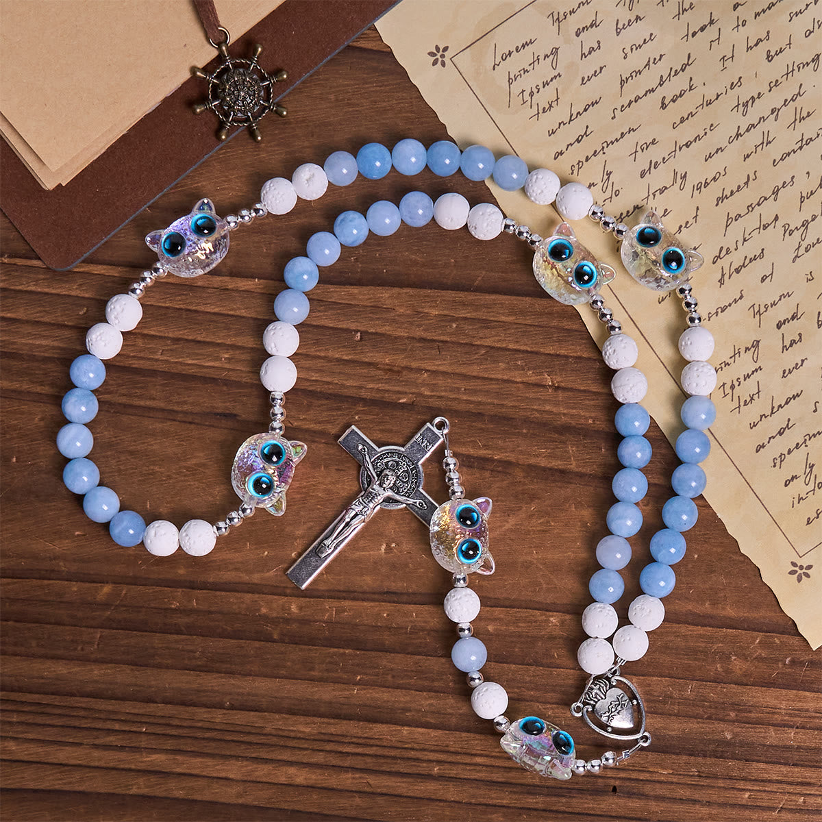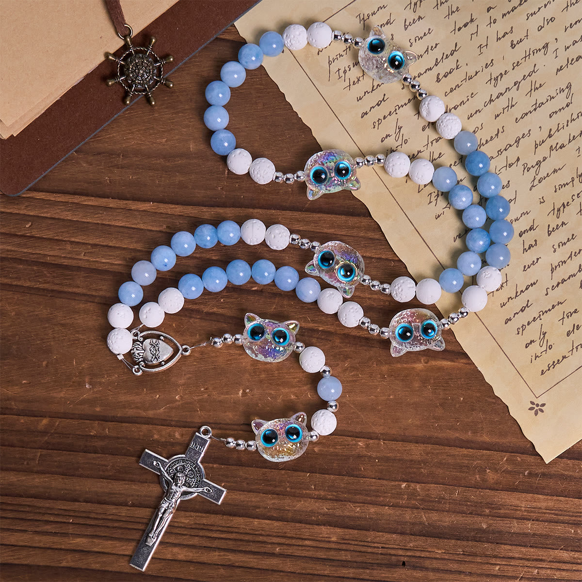 The gentle blue and white beads evoke the peace of Heaven, while the shimmering kitty accents symbolize the innocence and beauty of God’s creation, echoing the truth that all life is precious in His eyes. -