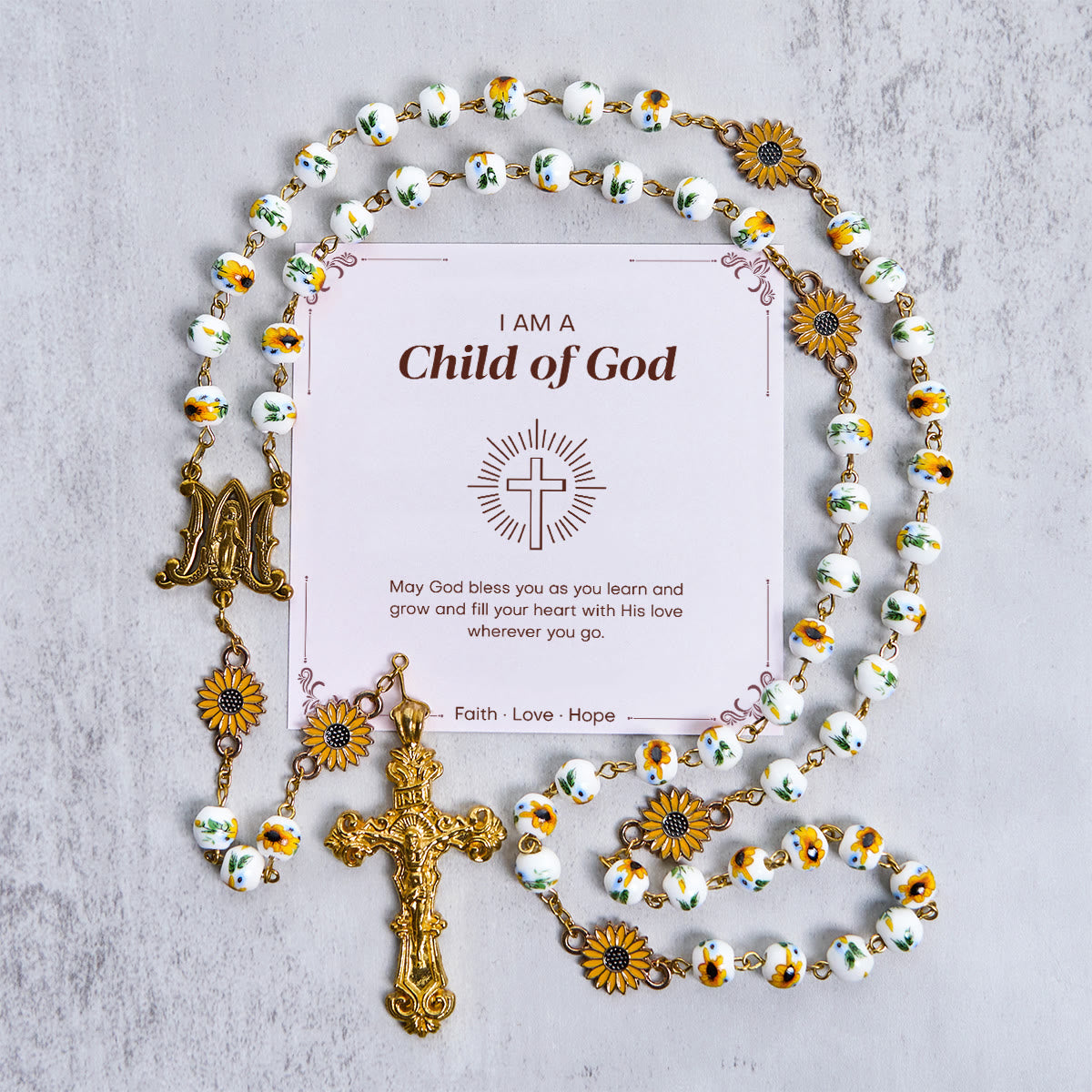The rosary features hand - painted beads adorned with sunflower motifs. Sunflowers can symbolize the light of God, always turning towards the sun, much like we should turn towards the divine.