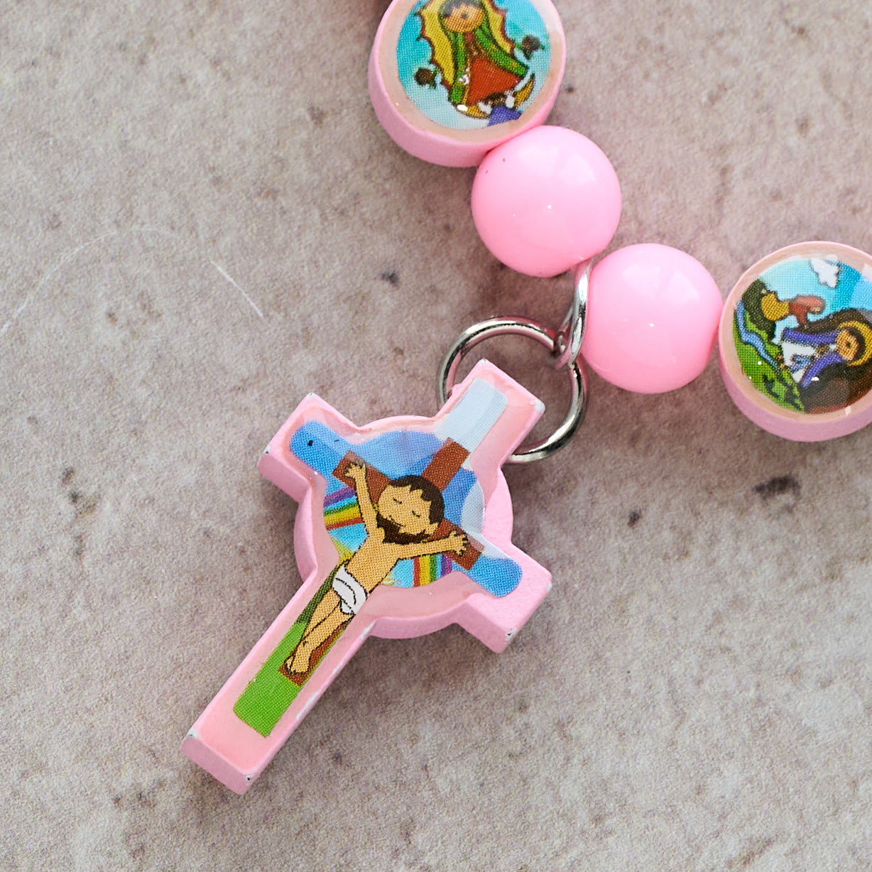 Meticulously made with smooth acrylic beads and vivid sacred imagery, the design centers on a colorful cross. It’s a soft, durable accessory that honors faith while fitting little hands.