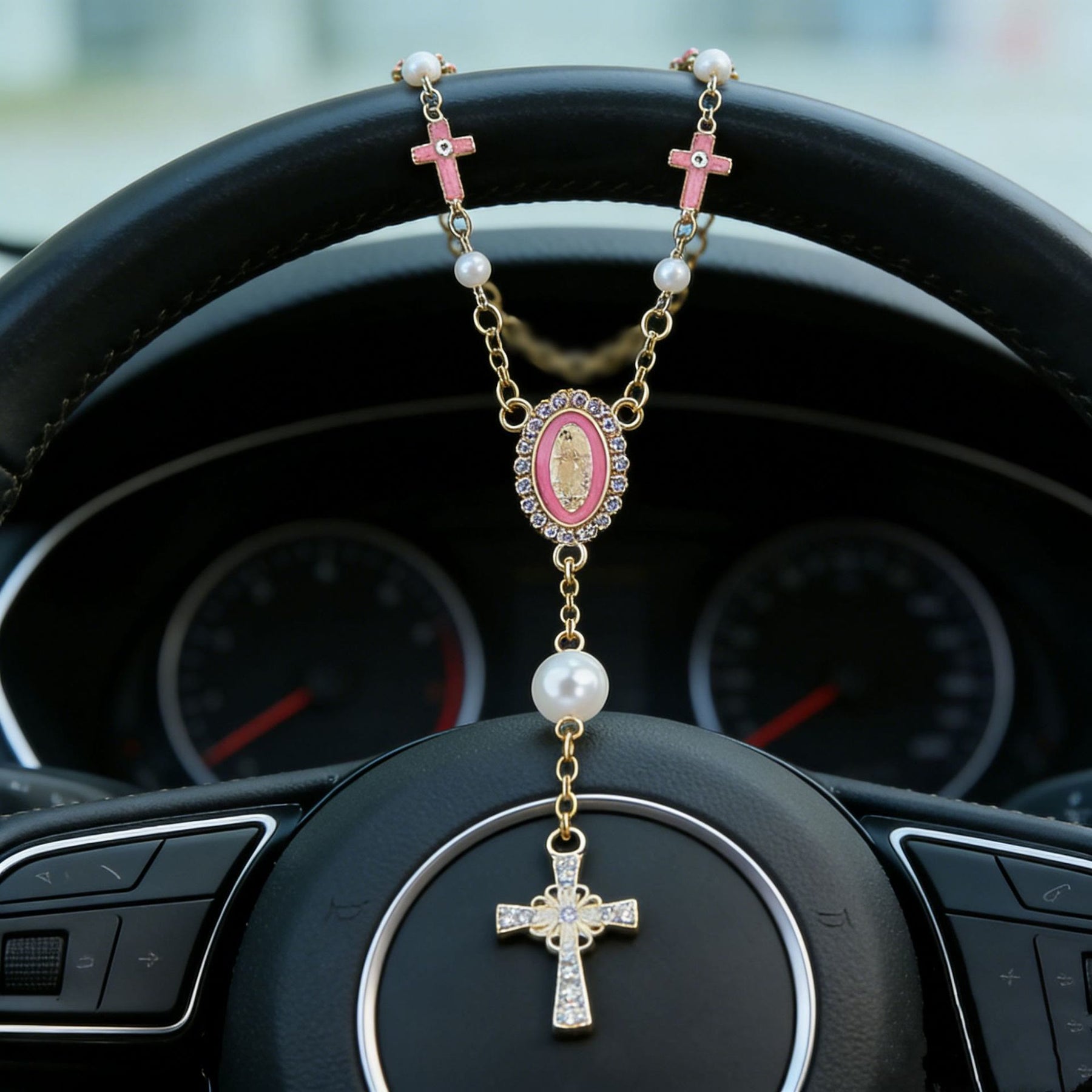 Crafted from polished metal with detailed iconography, sparkling crystal accents, and a sturdy pearl-beaded chain, this car pendant preserves the sacred weight of faith and protection. Built to withstand daily use in vehicles, its durable design and vibrant details maintain a reverent, elegant look for years, keeping your devotion close at hand.