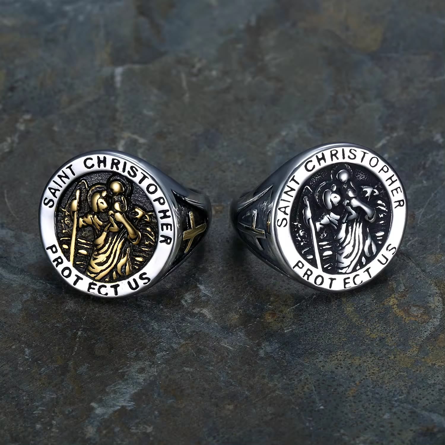 A classic signet-style ring features a detailed relief of Saint Christopher carrying the Christ Child, framed by the inscription “SAINT CHRISTOPHER PROTECT US.” The band is accented with a subtle cross, and the ring is available in polished gold, silver, and two-tone finishes. This substantial ring anchors faith in a visible declaration of trust in the patron saint of travelers. -
