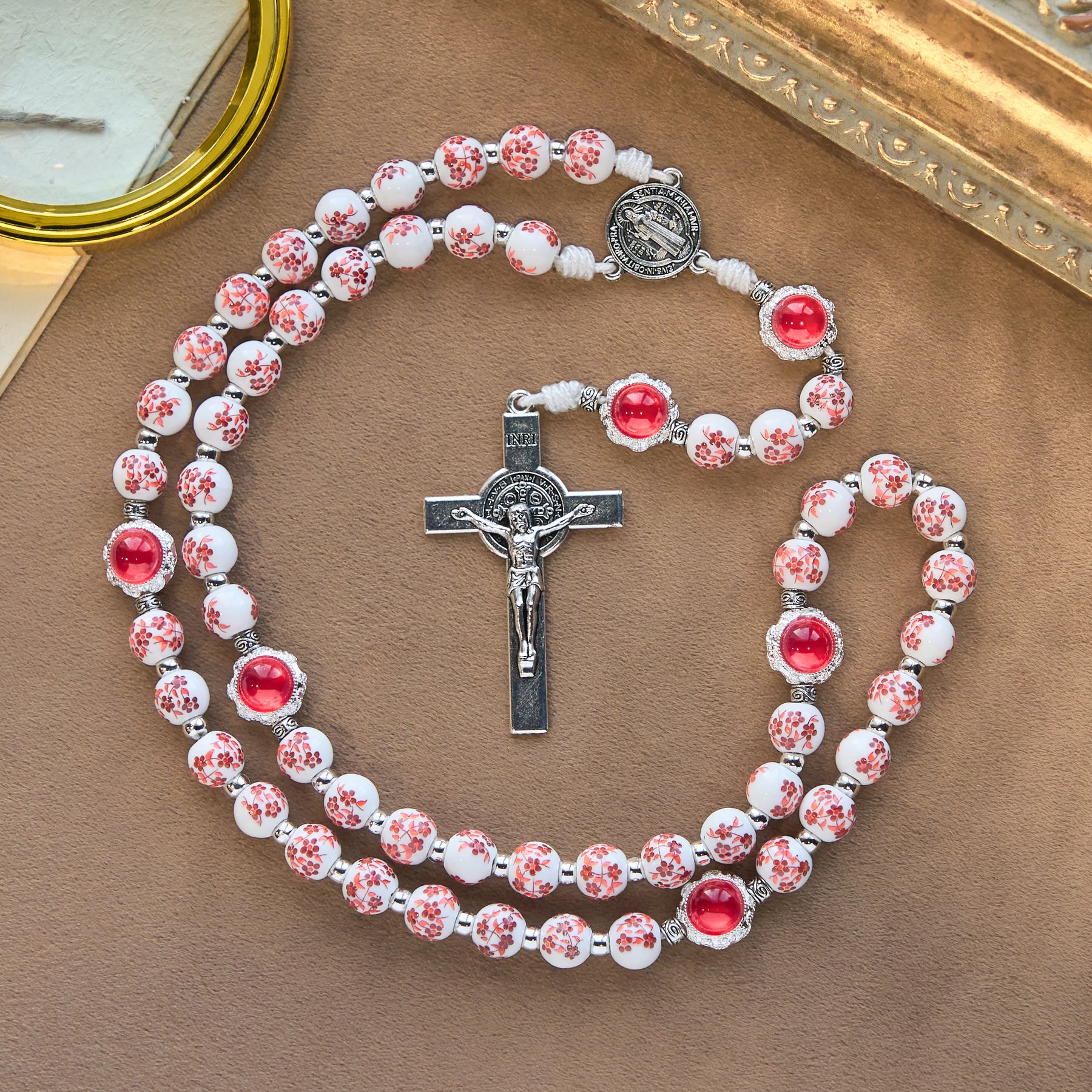 The red-floral porcelain beads, like petals of faith, flow toward the silver crucifix, rooting each prayer in divine depth. It merges porcelain charm with sacred symbolism, honoring the beauty of spiritual devotion.