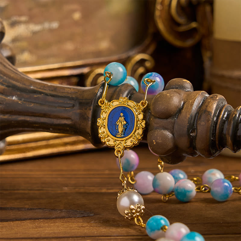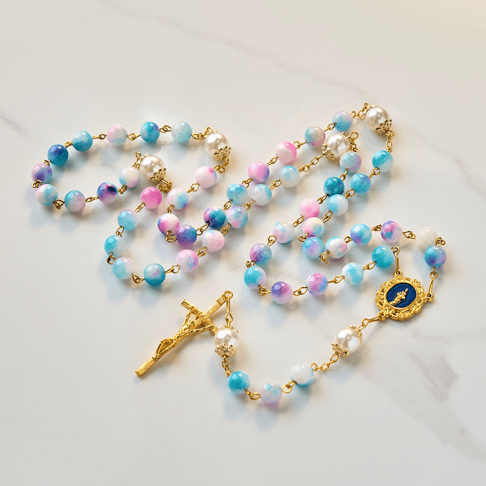 Colorful Beads: The rosary features beads in serene shades of blue, pink, and white along with pearlescent accents, symbolizing tranquility, love, and purity. These vibrant beads are designed to soothe your soul during prayer.