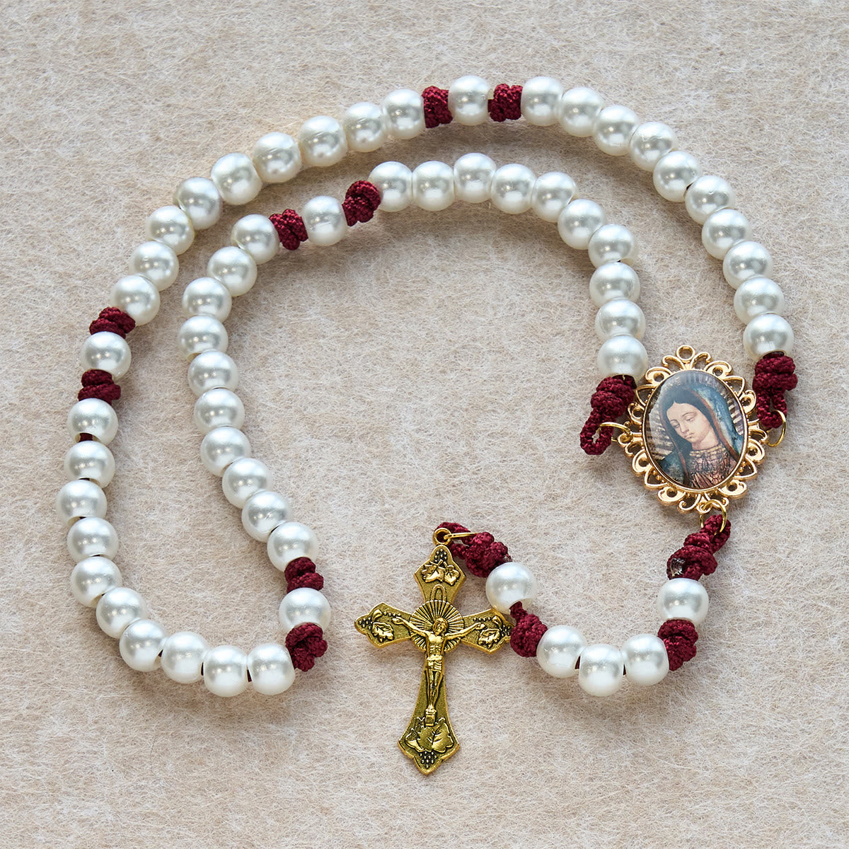 The smooth white beads call the heart toward holiness and renewal, mirroring the radiance of the Holy Spirit. Each burgundy knot stands as a quiet vow — a symbol of dedication forged through prayer. The contrast of white and wine-red forms a sacred dialogue of purity and sacrifice, echoing Christ’s redeeming love and the believer’s faithful response.