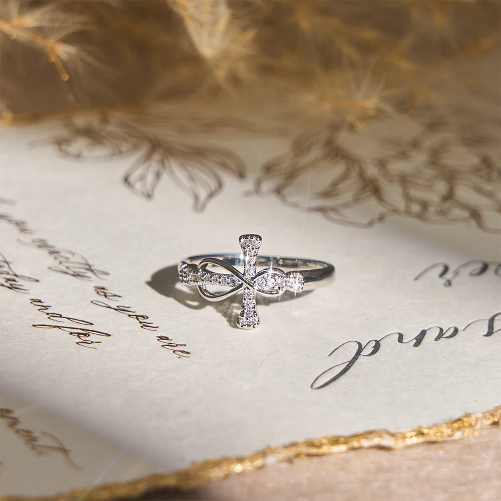 This Mobius Cross Ring (featuring a delicate fusion of a Mobius loop and cross shape, encrusted with sparkling stones, available in gold and silver finishes) merges sacred cross symbolism with the infinite loop of a Mobius design — turning daily wear into a gentle reminder of His eternal love.