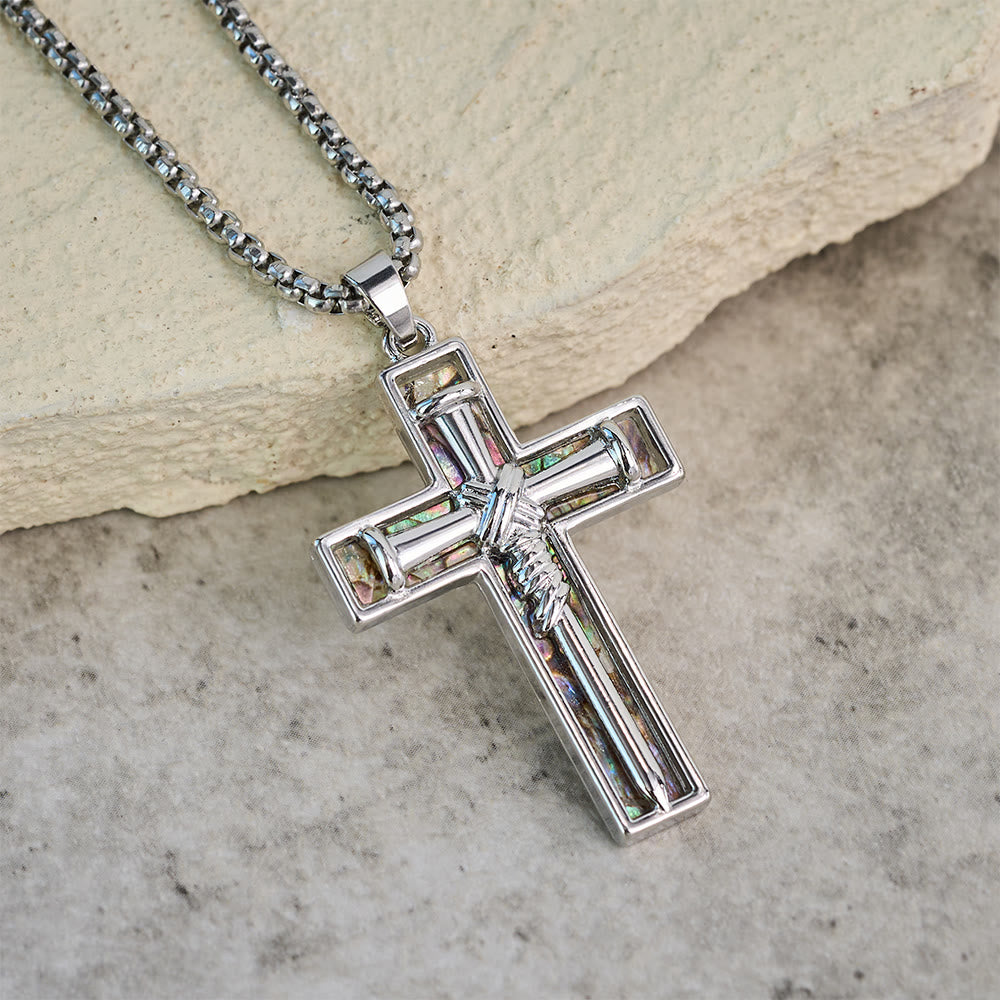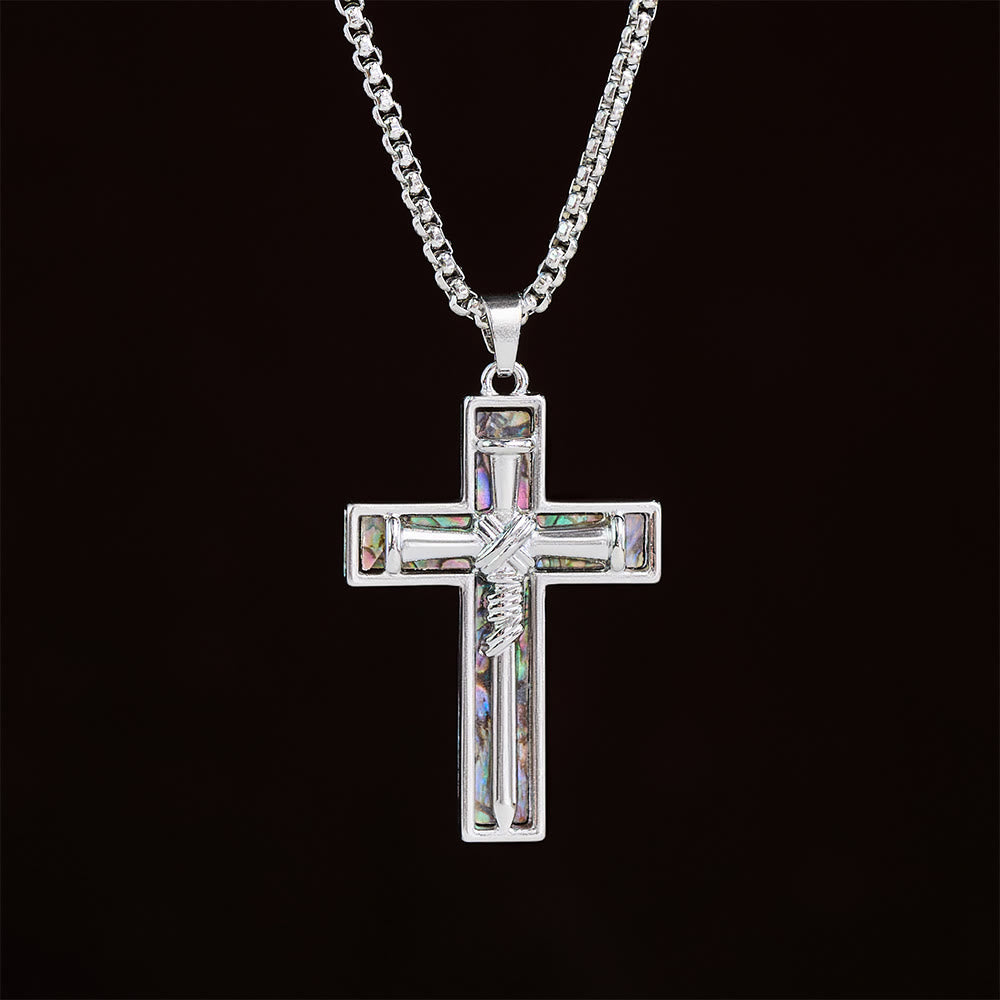 This abalone shell inlay nail cross necklace (in silver-toned metal) merges the sacred symbolism of the nail cross (representing Christ’s crucifixion) with iridescent abalone shell inlay—pairing polished metal craftsmanship with the unshakable promise of Christ’s redemptive love to craft a wearable companion for faith. -