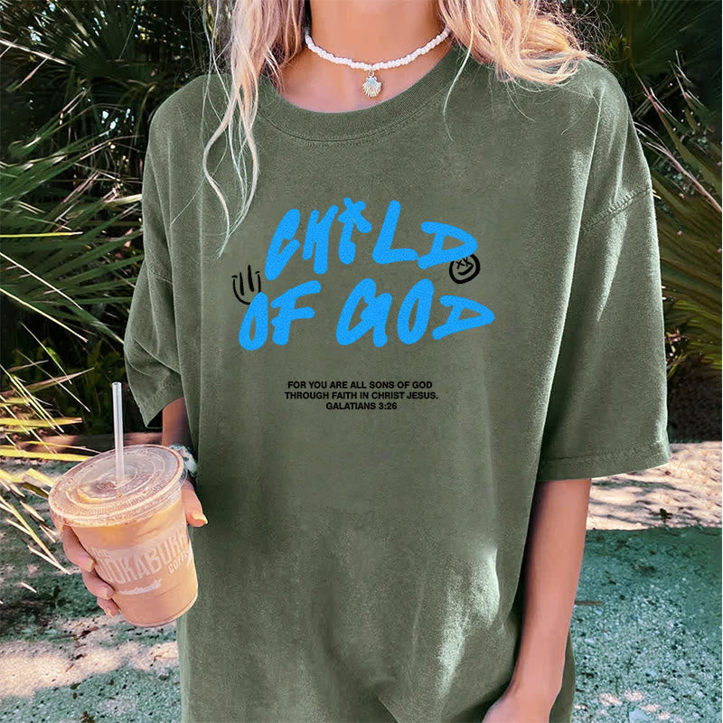 This T-shirt, with a stylish washed finish, delivers a dynamic spiritual message. On the front, “CHILD OF GOD” is vividly printed in graffiti-style blue, paired with the biblical reference from Galatians 3:26, expressing a vibrant religious connection. It serves as a constant reminder of one's divine identity rooted in faith, a lively aspect of faith - based life. The placement of the design on the shirt makes it a visible declaration of spiritual belonging.