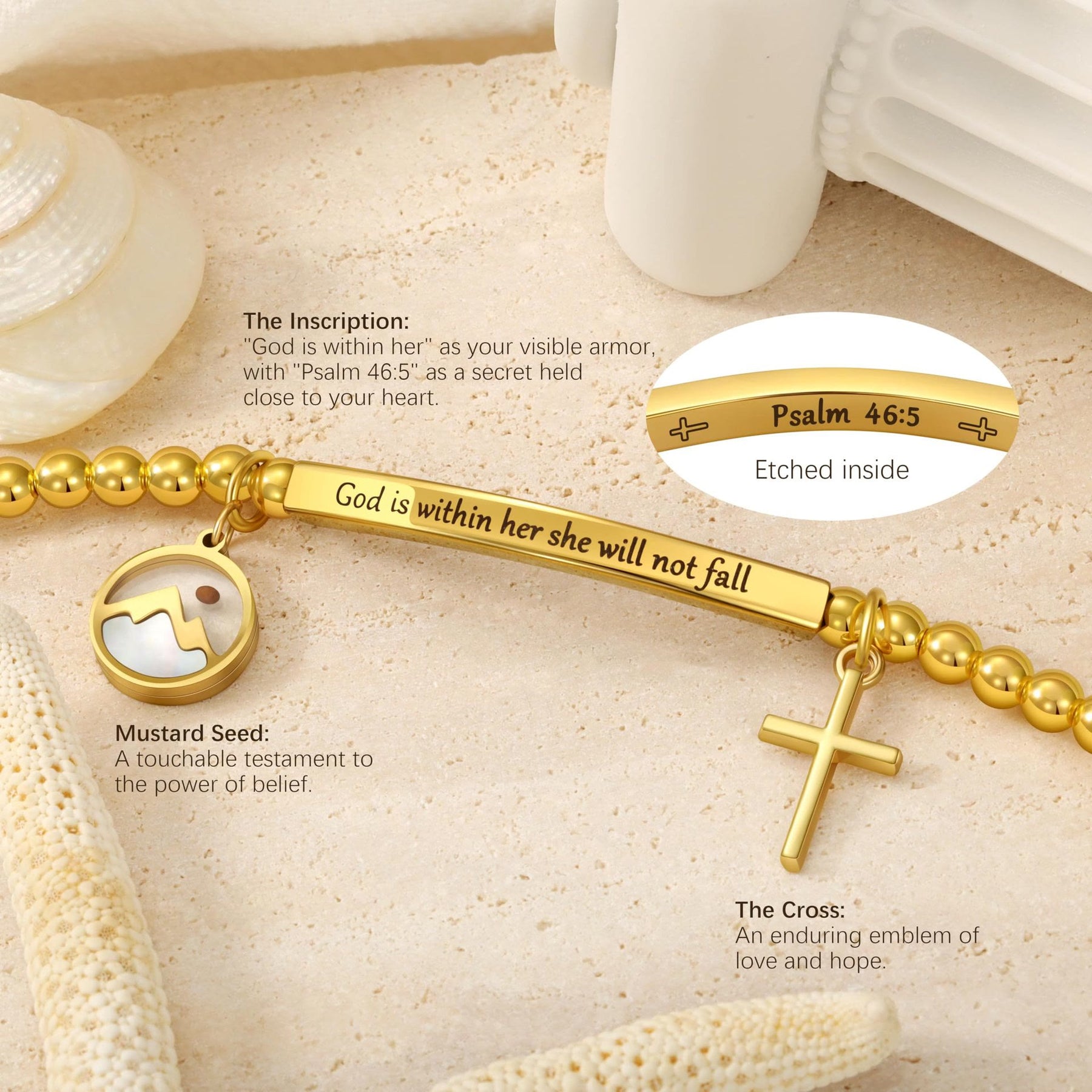 This gold-bead bracelet merges the "mustard seed faith" motif (Matthew 17:20) with cross accents and the verse "God is within her" — pairing spiritual warmth with delicate design to create a soothing companion for daily moments. -