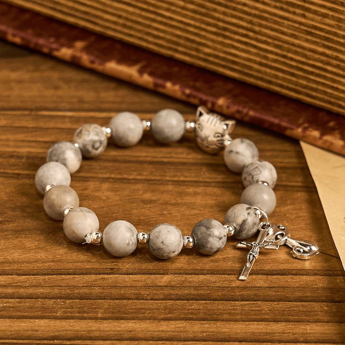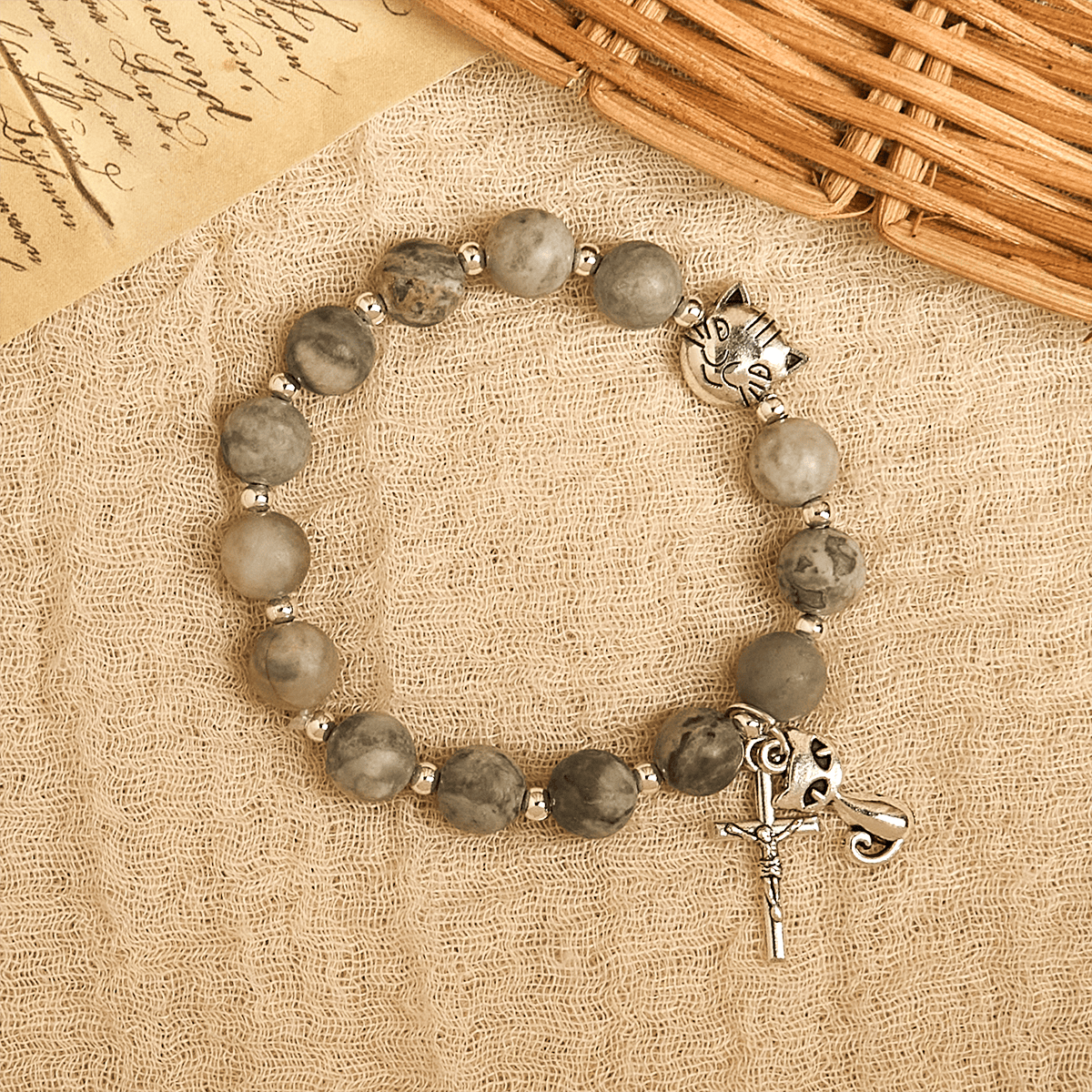 This prayer bracelet strings soft light-grey beads with twin tabby-cat charms and a tiny crucifix—calm, timeless, and made to keep love for pets and strays close at hand. -