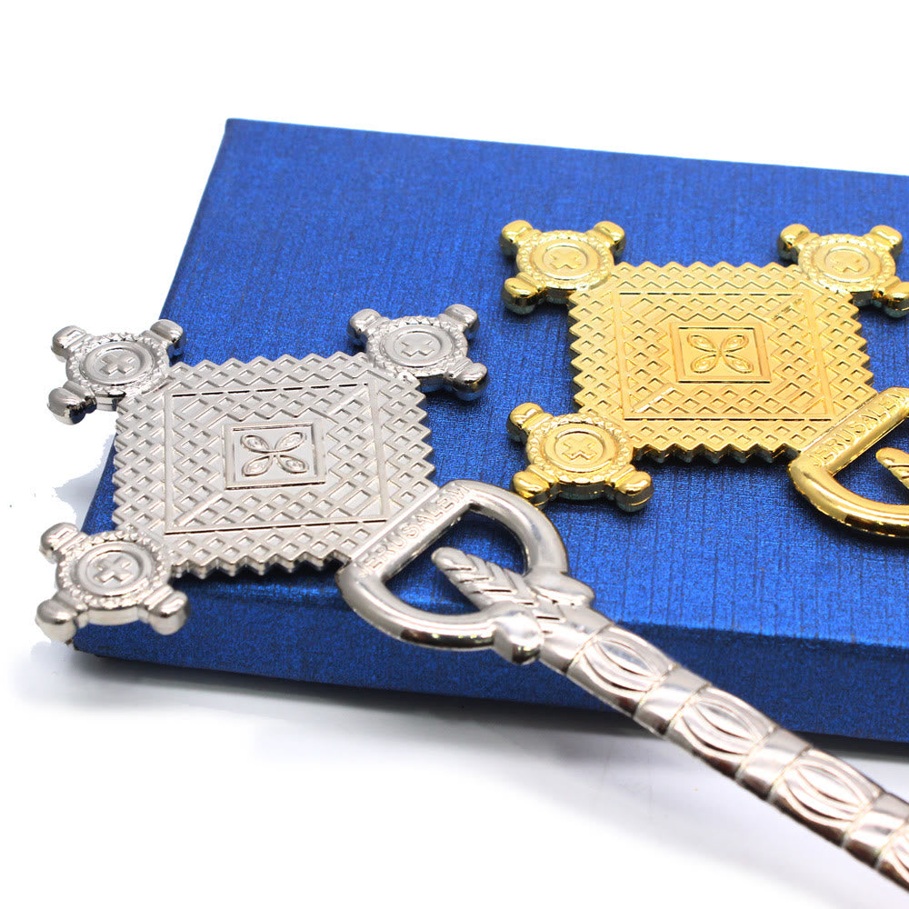 Magnificent Design: The cross features a splendidly detailed design, with a central diamond-shaped motif surrounded by intricate patterns that symbolize eternity and divine protection. The geometric precision and artistic detailing are a tribute to the heritage of religious artistry.