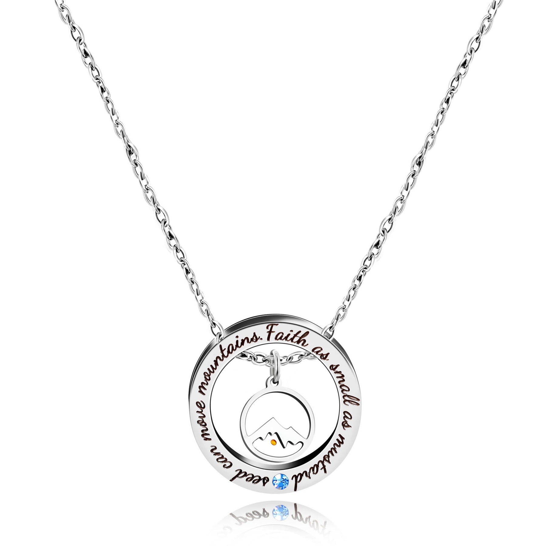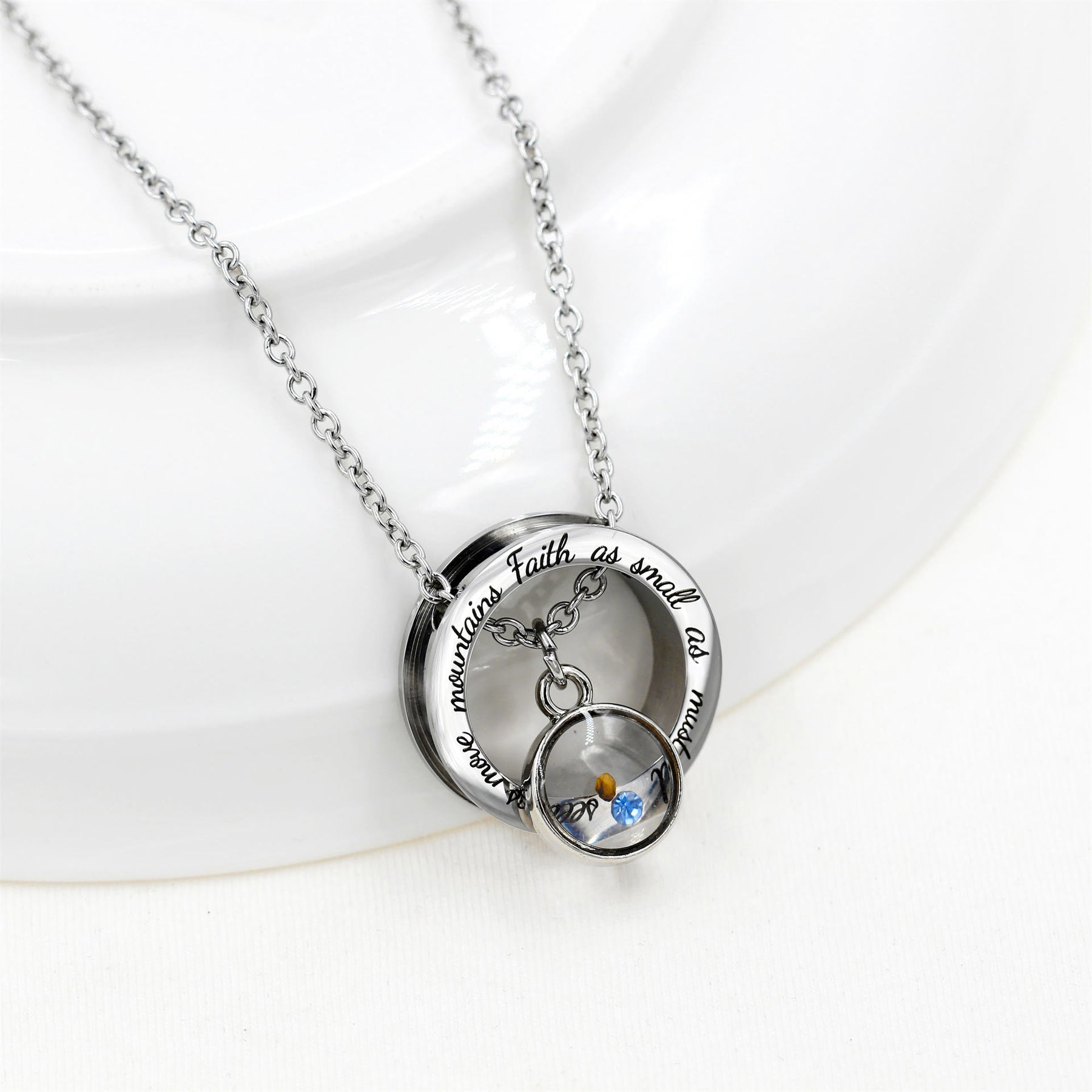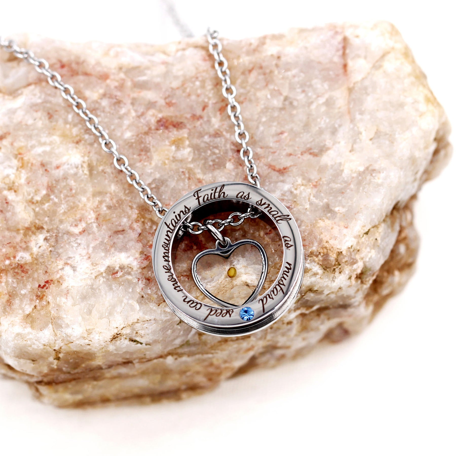 Forged in polished metal, each circular pendant bears the classic mustard seed faith phrase, paired with a seed-embedded teardrop/heart charm. Meticulously made, the series honors your faith journey, blending the mustard seed’s symbolic power and diverse, elegant styles. -