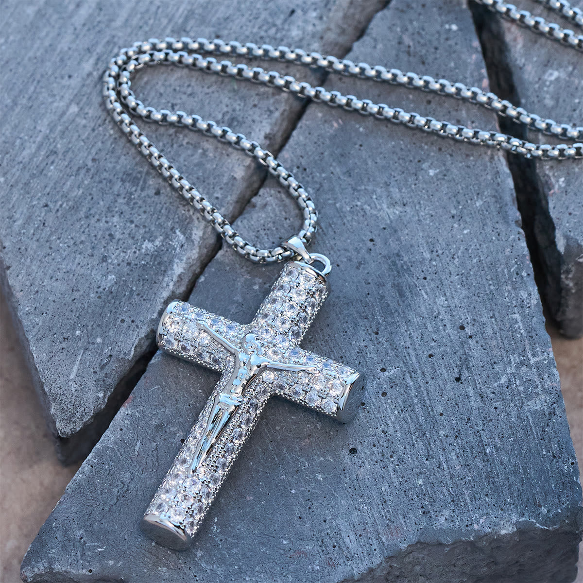 This Jesus crucifix necklace merges faith and glamour, adorned with a paved, detailed crucifix pendant on a polished chain. Sacred symbolism meets sparkling design, crafting a unique spiritual accessory. -