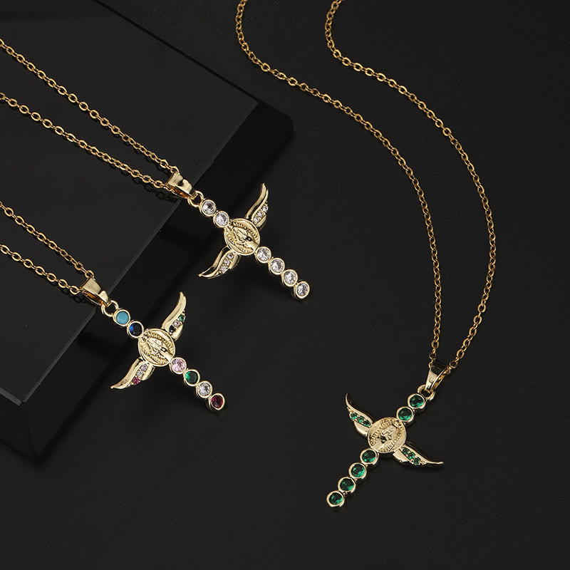 Embrace the profound symbolism etched in each detail of this exquisite necklace, a heavenly talisman designed to lead you on a journey of faith and inspiration. Let the shimmering stones and mystical emblems remind you of Christ's eternal grace and unfaltering protection. -
