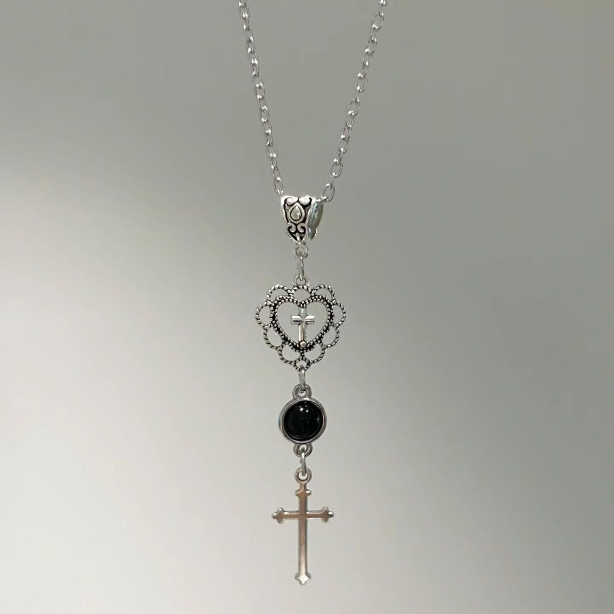 This layered necklace draws the eye from an ornate heart frame with an inner cross to a slender cruciform drop—an elegant “path from heart to Cross.”