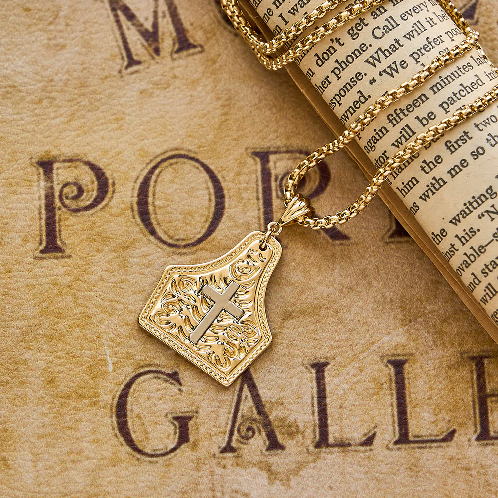 This cross pendant necklace (offered in two colors) merges an ornate, detailed design with a central cross — pairing classic style with the quiet weight of belief to craft a wearable reminder of His love.