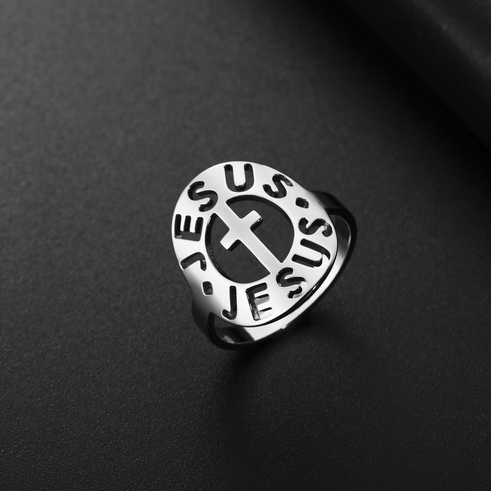 A striking openwork design frames a central cross, surrounded by the cutout letters “JESUS.” Available in polished gold and silver finishes, this ring anchors faith in a bold, visible declaration of His love.