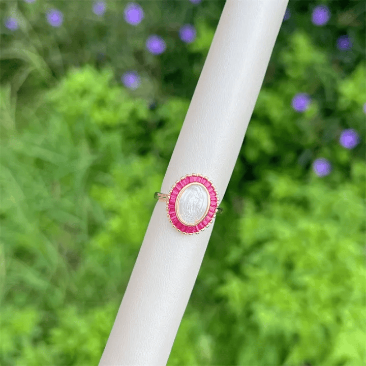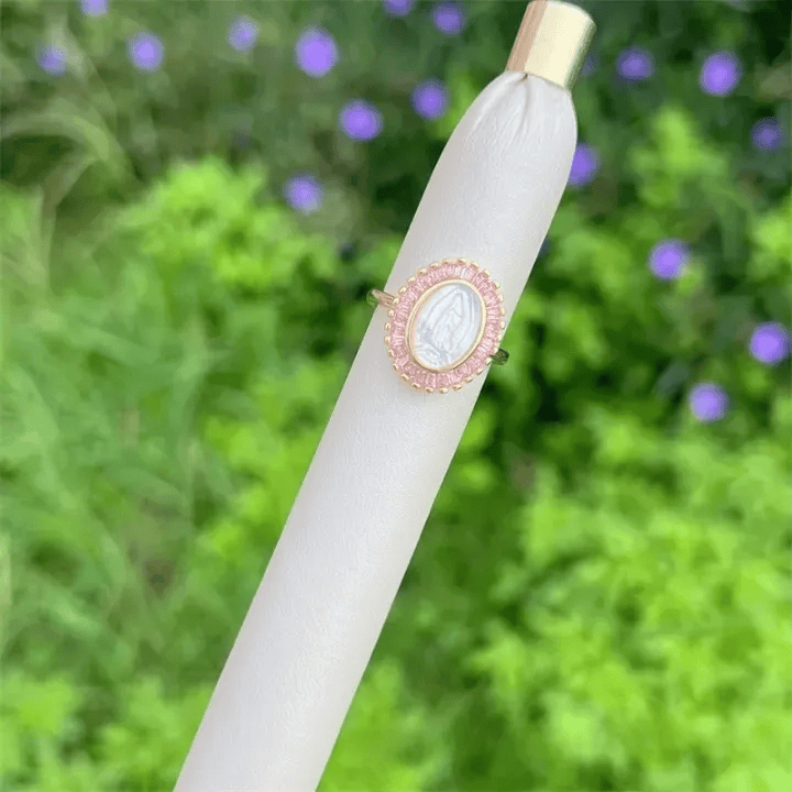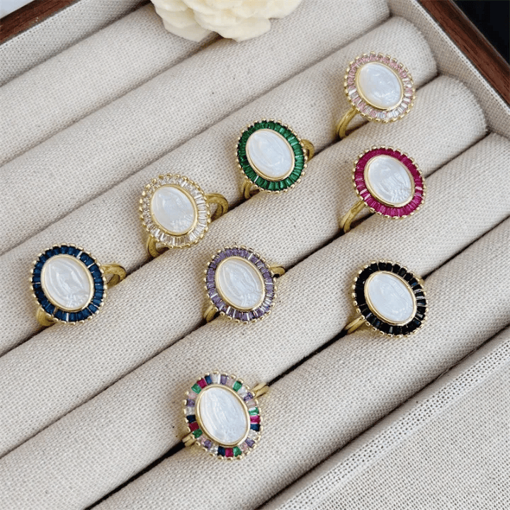 This ring (offered in multi-tone styles) merges a white Our Lady cameo with colorful zircon accents (set in 18K gold-plated copper) — pairing radiant design with the quiet comfort of her intercession to craft a wearable reminder of grace.
