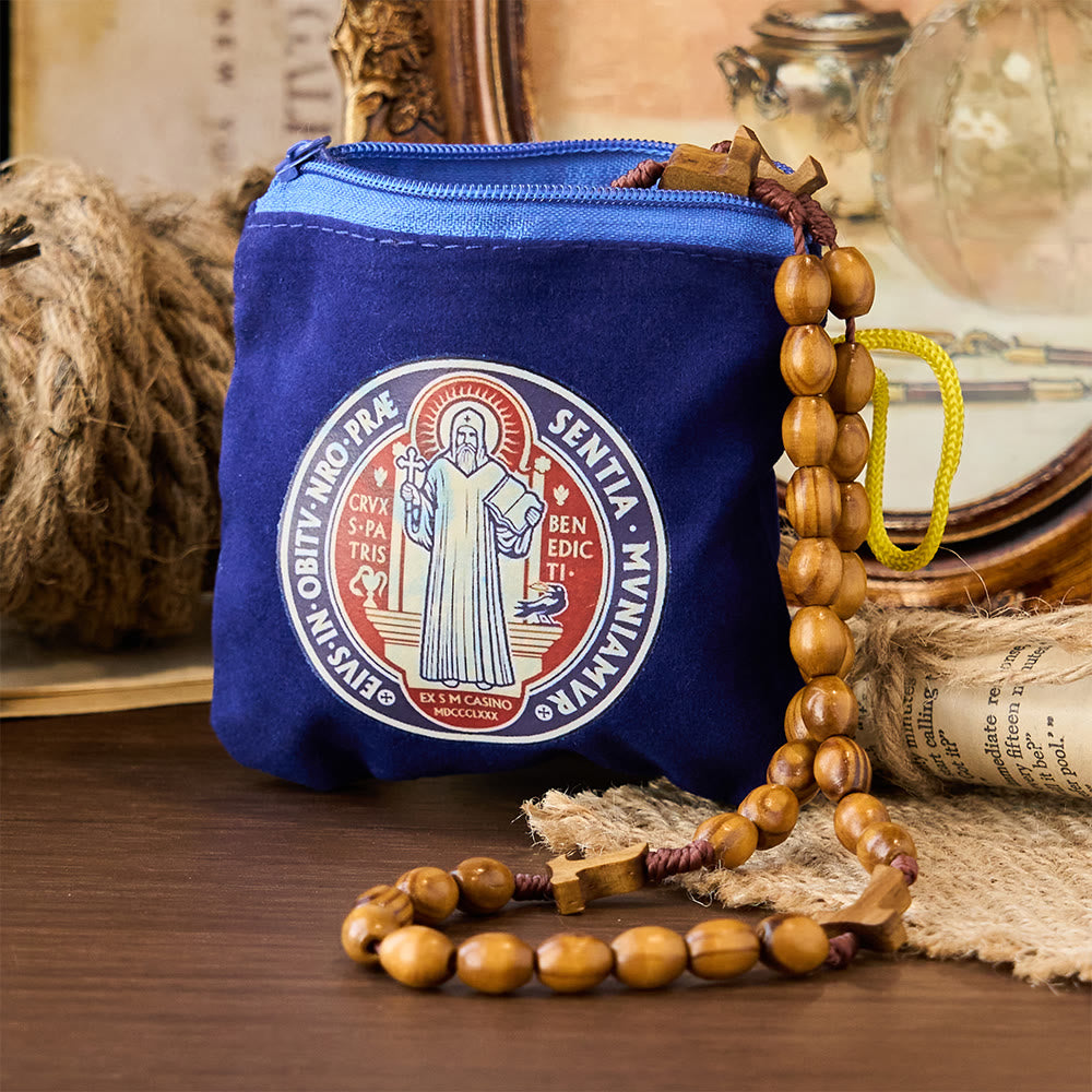 Each storage pouch is adorned with the emblem of St. Benedict, an ancient and sacred symbol offering protection and peace to its bearer. Whether for daily use or travel, this pouch provides a comforting reminder of St. Benedict's watchful care.