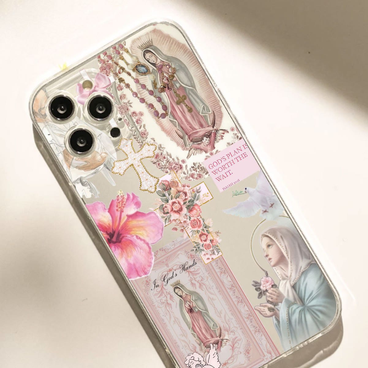 This phone case weaves sacred imagery (Our Lady motifs, crosses, and the “In God’s Hands” phrase) with soft florals — a gentle emblem of divine presence and devotion.