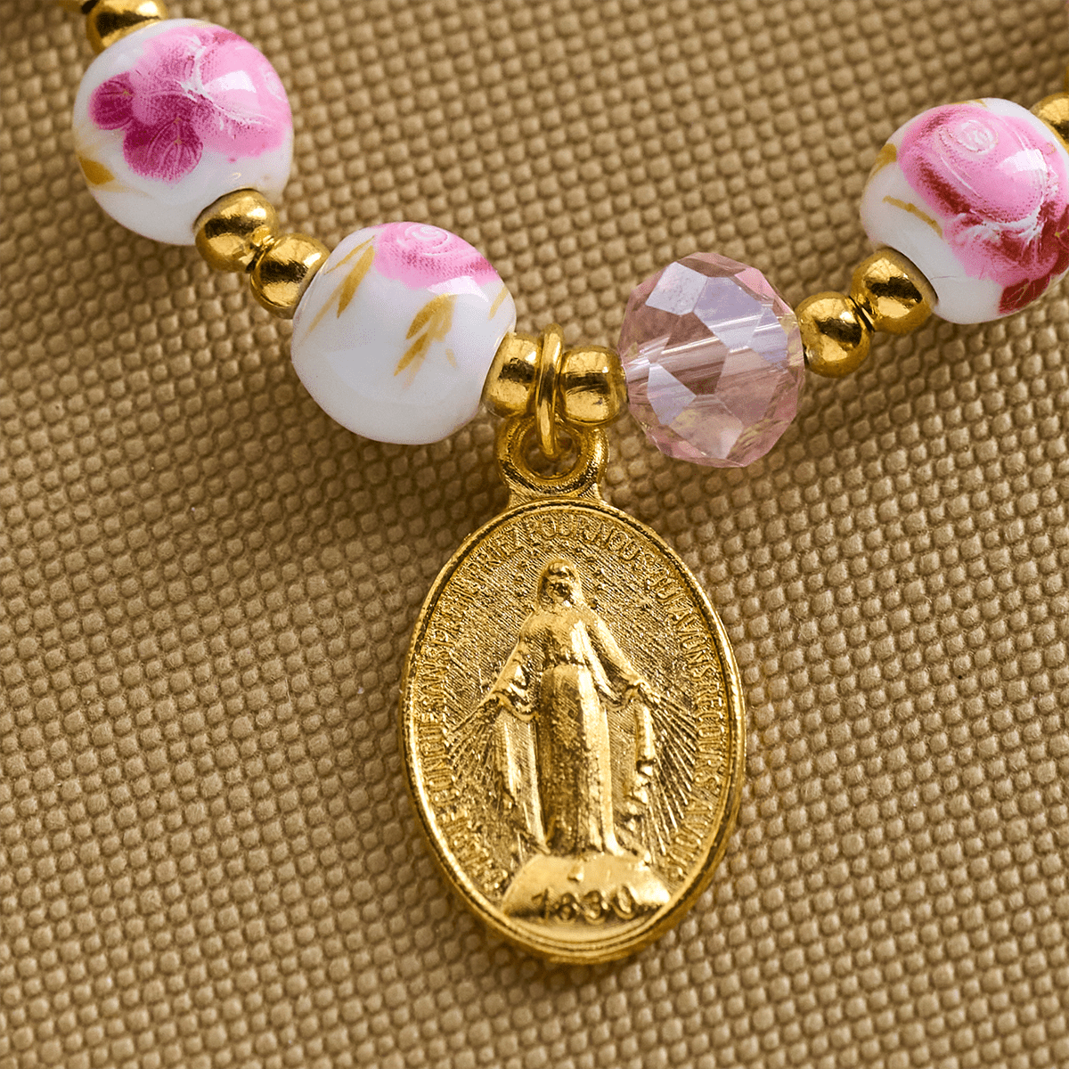 Christianartworkshop Elegant 8mm Flower Pattern Pink Ceramic Bracelet with Miraculous Medal - image 1