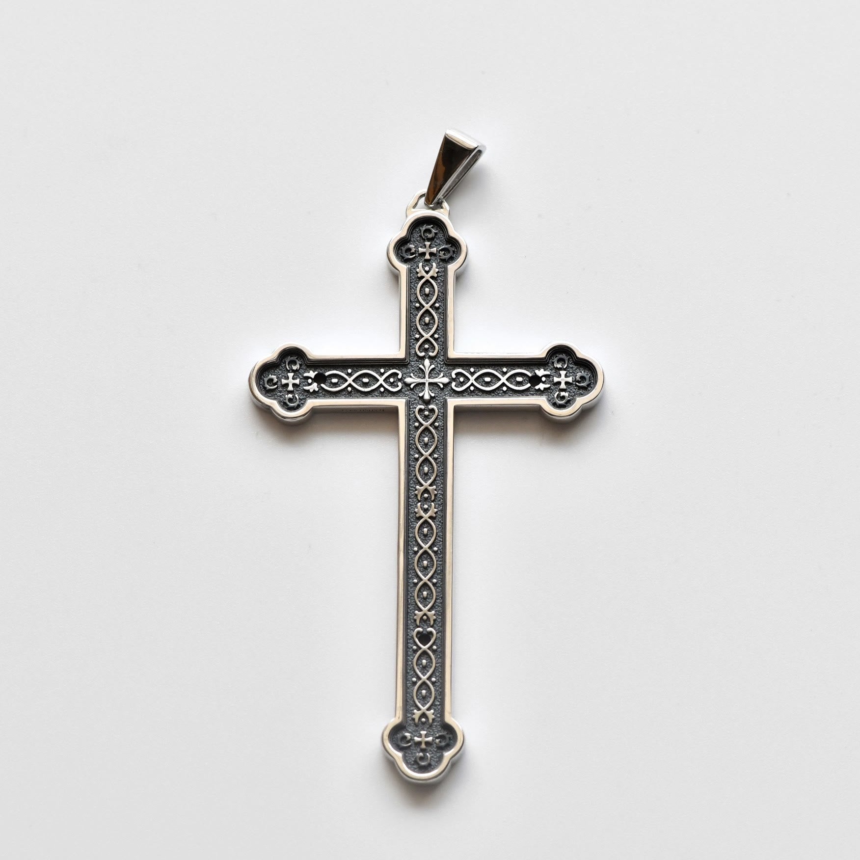 A retro sterling silver cross bears the INRI inscription—time-worn letters whispering Christ’s sovereign sacrifice. Forged as a tactile testament of enduring faith. -
