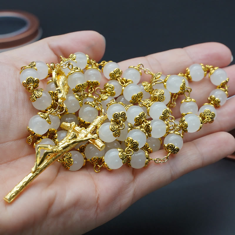 This rosary wraps faith in luminous, gentle charm—crafted with smooth natural white chalcedony beads, paired with ornate gold-toned filigree accents and a detailed crucifix. The milky white hue of chalcedony mirrors the purity of Christ’s love and the tenderness of Our Lady’s intercession, turning every prayer into a quiet embrace of divine grace.