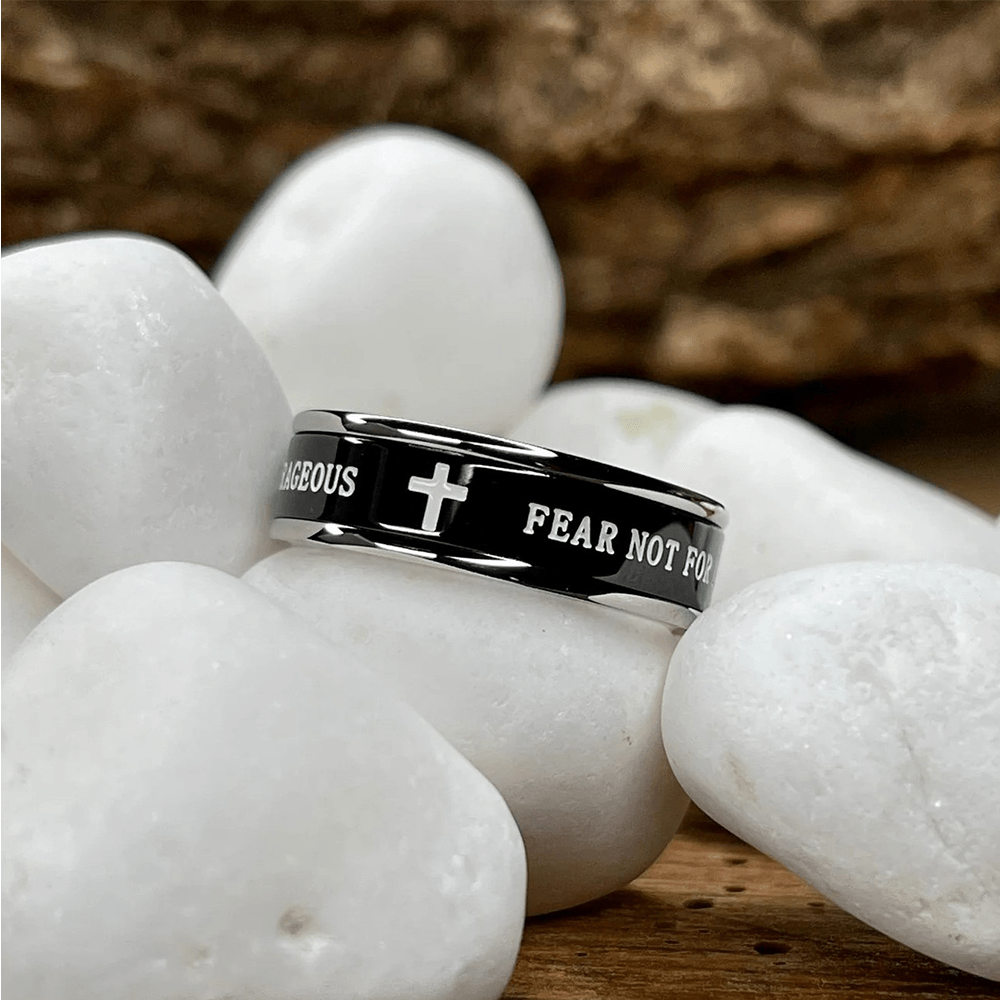 A sleek, two-tone rotating band engraved with the phrase “FEAR NOT” and “COURAGEOUS,” accented by a subtle cross. This polished, modern ring anchors faith in a daily reminder to walk in courage and trust in His promise. -