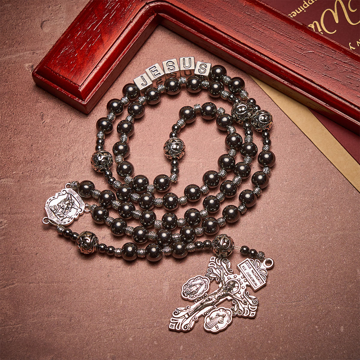 This custom black agate rosary unites timeless devotion with the valor of heavenly guardianship. Crafted with deep-black agate beads and adorned with the Shield of St. Michael, it embodies steadfast faith, unyielding strength, and the personal declaration of “JESUS”—a prayer forged in courage and trust.