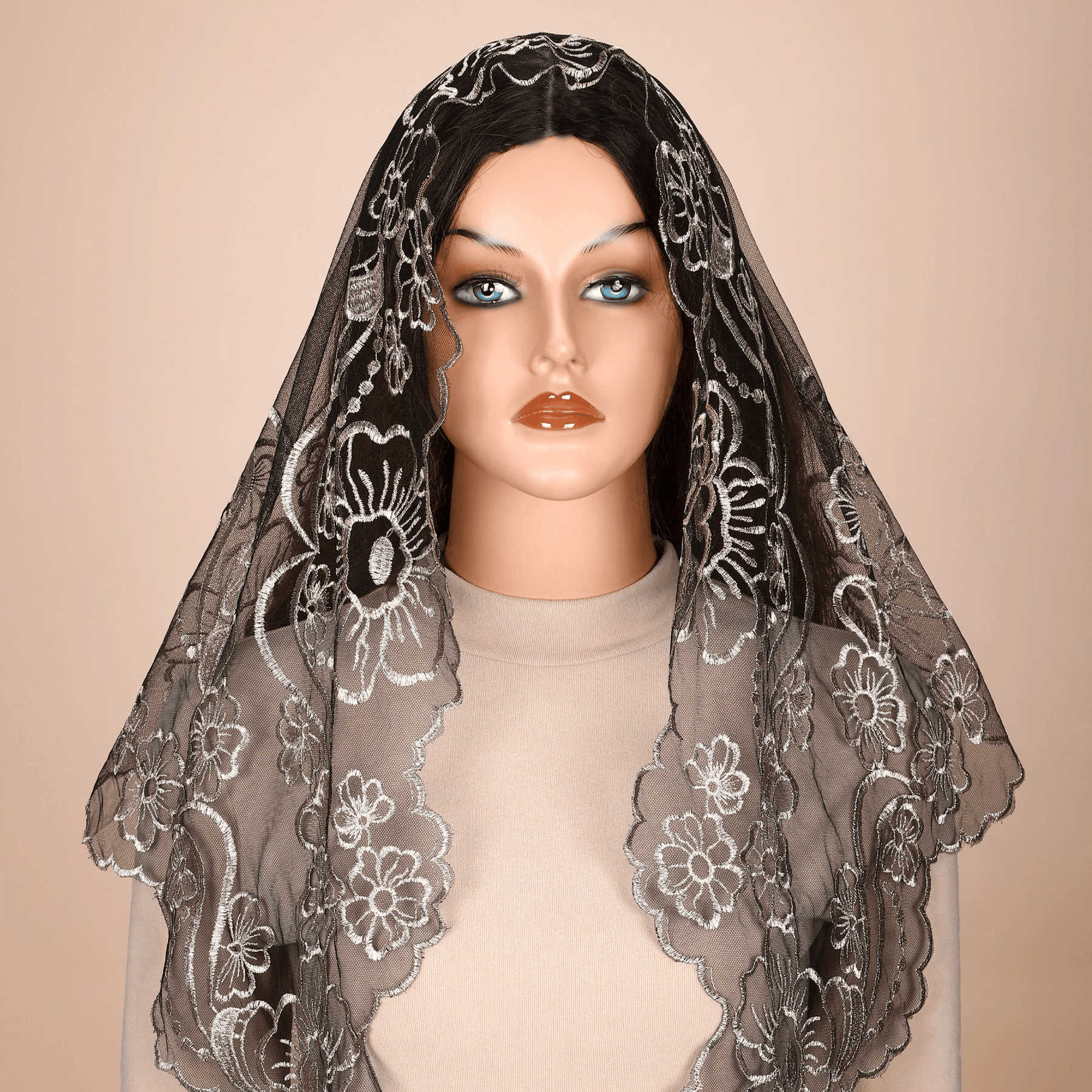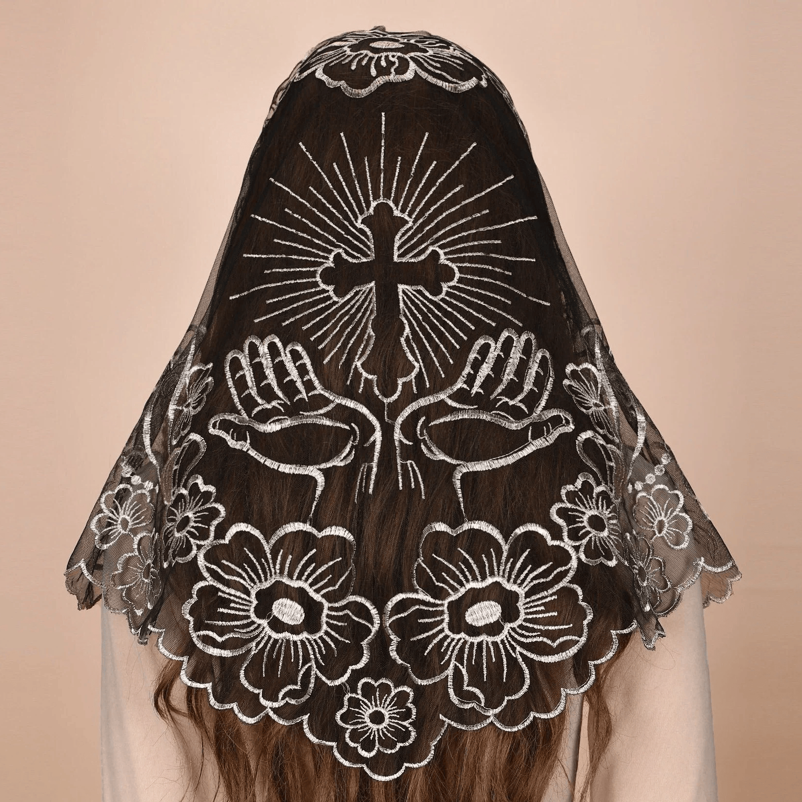 Christianartworkshop Elegant Blessed Lace Chapel Veil with Cross and Praying Hands - Black Silver - image 0