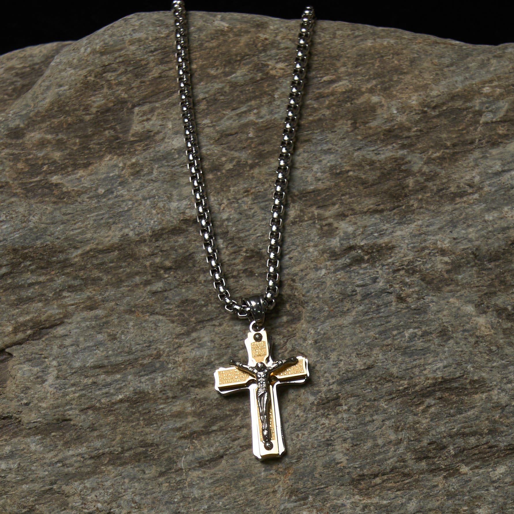 The polished two - tone finish gives the cross a blend of regal elegance and modern appeal, while the detailed portrayal of Christ’s crucifixion and the inscribed text carry the age - old story of sacrifice, redemption, and unwavering faith. -