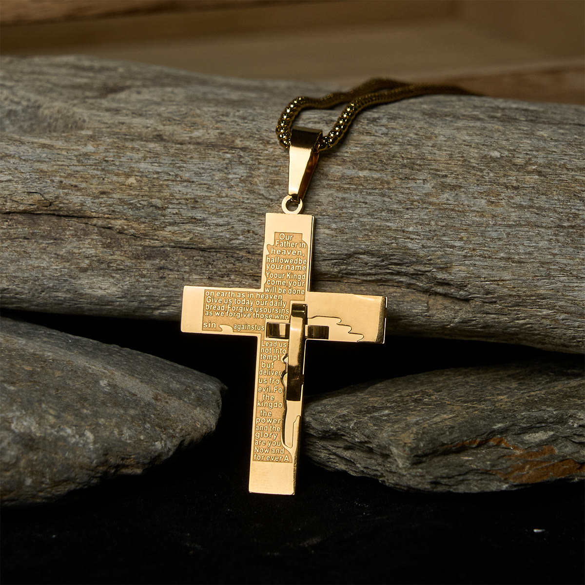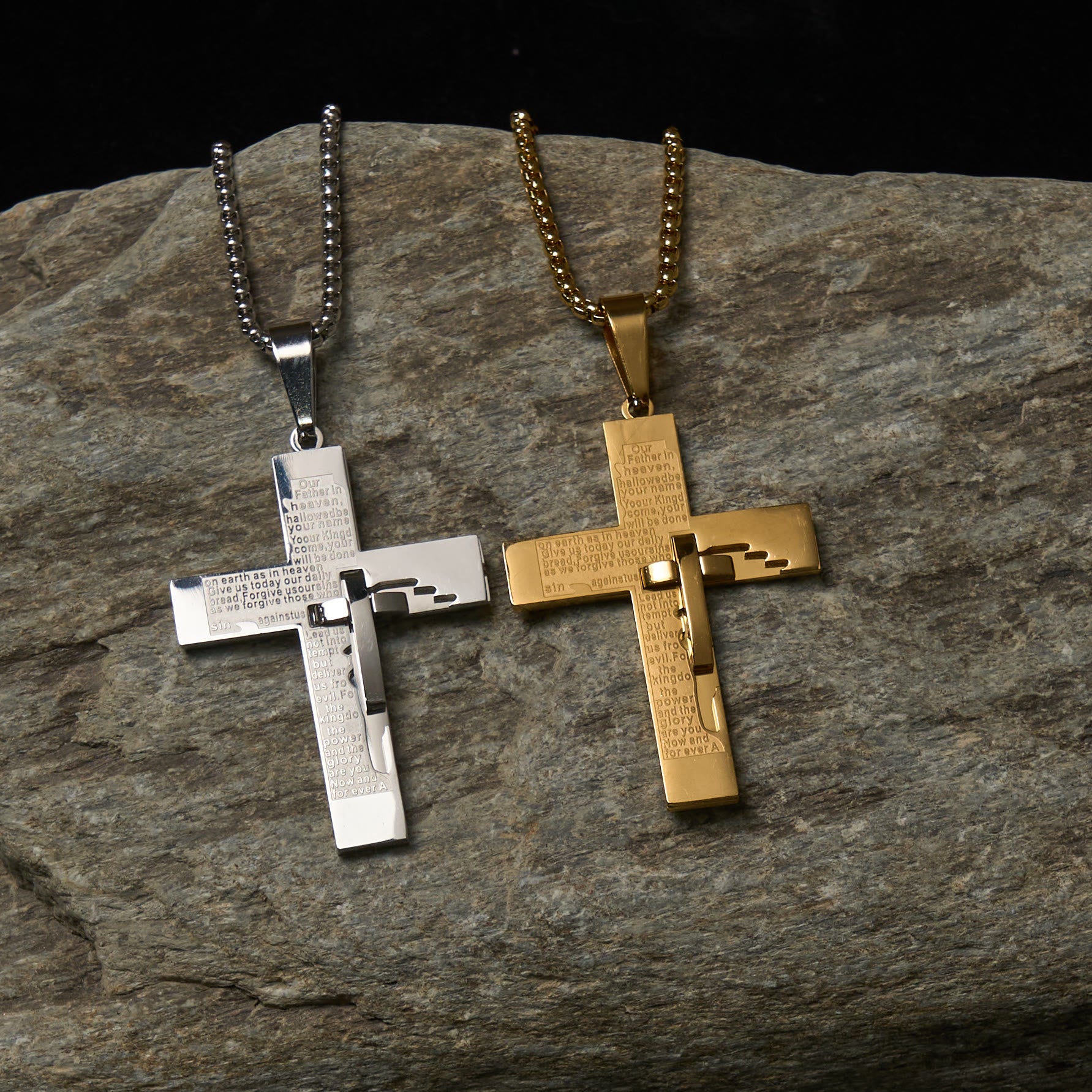 Golden and silver - toned cross pendants, crafted from stainless steel, stand as a vivid testament to faith and reverence. Their polished metallic sheen, the scripture - engraved details, and the structured crucifix design reflect a blend of divine wisdom (echoing prayers like the Lord’s Prayer) and the enduring strength of spiritual devotion, made to be a lasting symbol of faith - centered identity. -