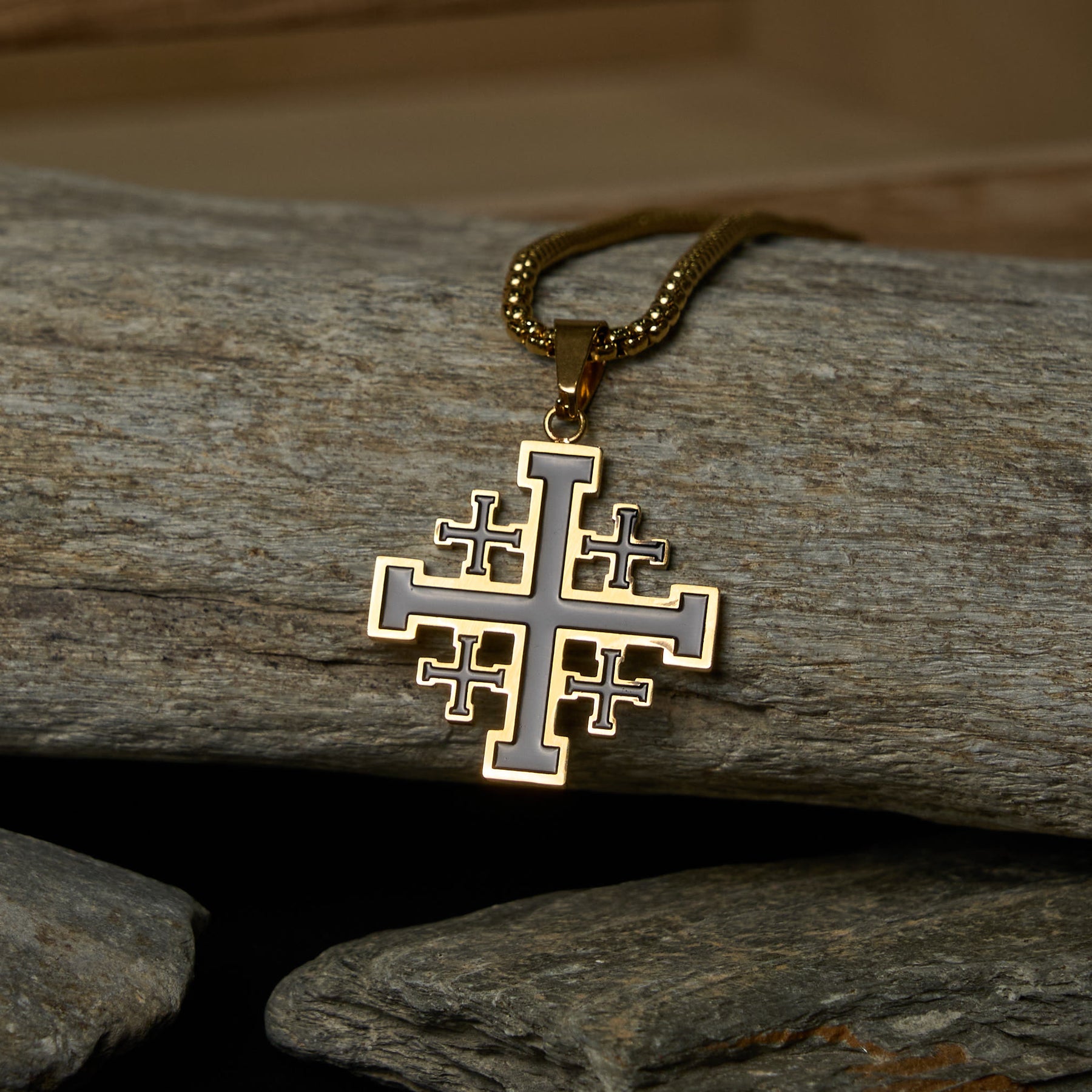 The Jerusalem Cross, also known as the Crusader’s Cross, features a large central cross surrounded by four smaller crosses. Traditionally, it symbolizes Christ's commandment to spread the Gospel around the world, representing the idea of Jerusalem as the center of faith extending to the four corners of the earth. This pendant serves as a powerful reminder of Christ's teachings and the mission to share his love and message. -
