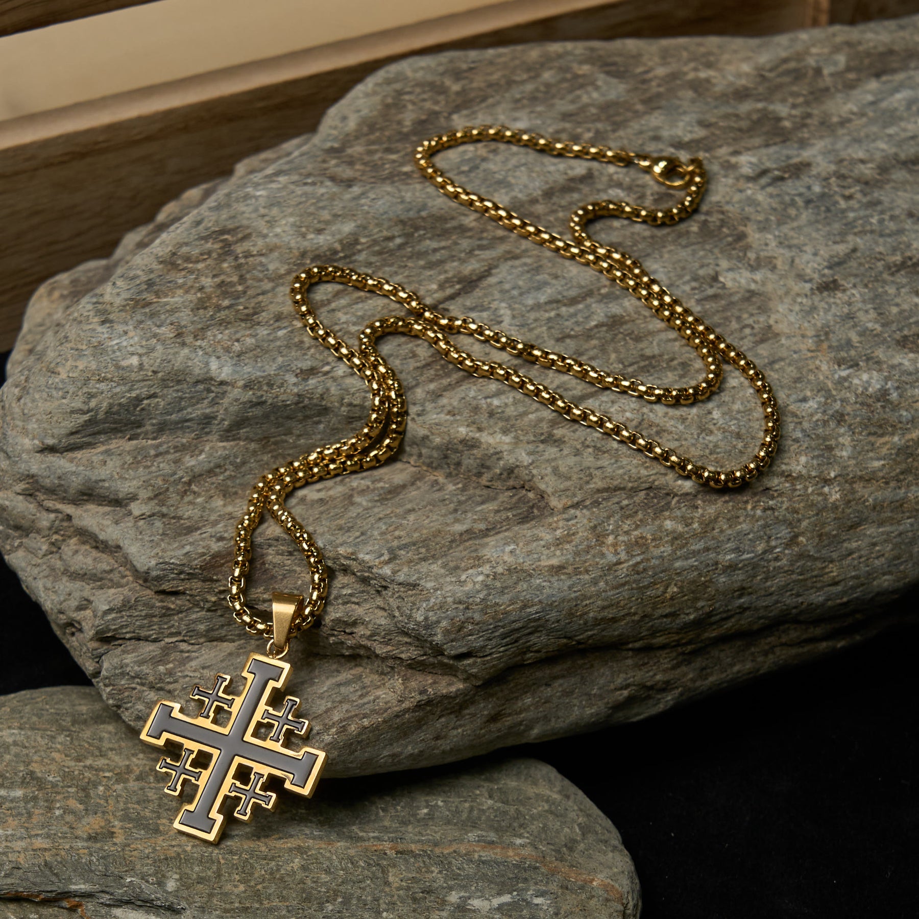Introducing the Jerusalem Cross Pendant, a piece that elegantly combines history, faith, and contemporary craftsmanship. With its bold geometric design, enriched by vibrant colors and contrasted textures, this pendant is more than just a piece of jewelry—it's a statement of faith. Available in multiple finishes, it offers versatility to suit any style or occasion. -